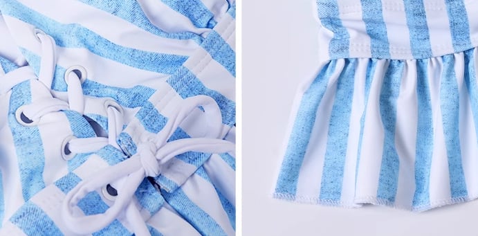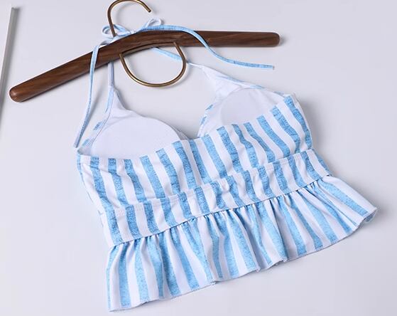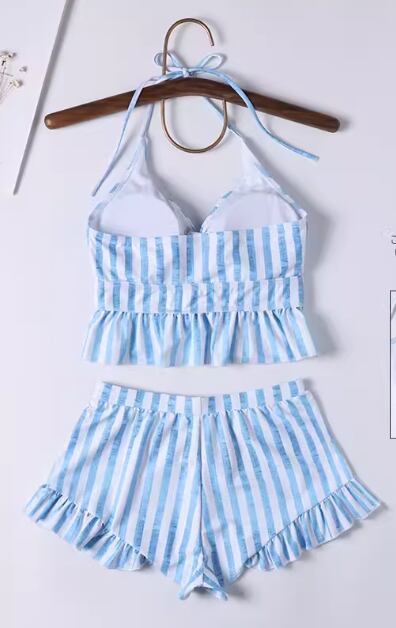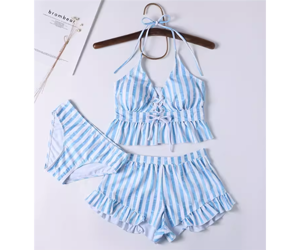 水着 ビキニ レディース ショートパンツ 短パン セパレート ホルターネック ノンワイヤー パッド付き リボン フリル レースアップ 編み上げ セット スリーピース 上下セット かわいい 大人可愛い カジュアル 華やか 大人っぽい おしゃれ お洒落 存在感 キュート ガーリー 個性的 スタイリッシュ セクシー ストライプ リゾート 旅行 温泉 プール 夏 海 高見え モテ こなれ感 M L XL Aカップ Bカップ Cカップ ブルー