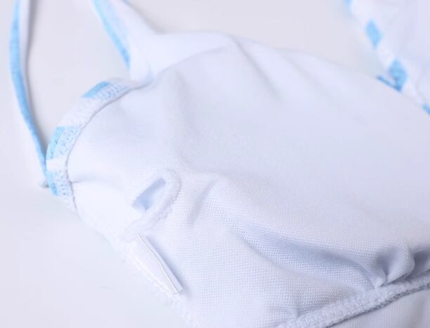 爽やかなブルーの色味と女性らしくてキュートなデザインが魅力的なビキニの3点セット。