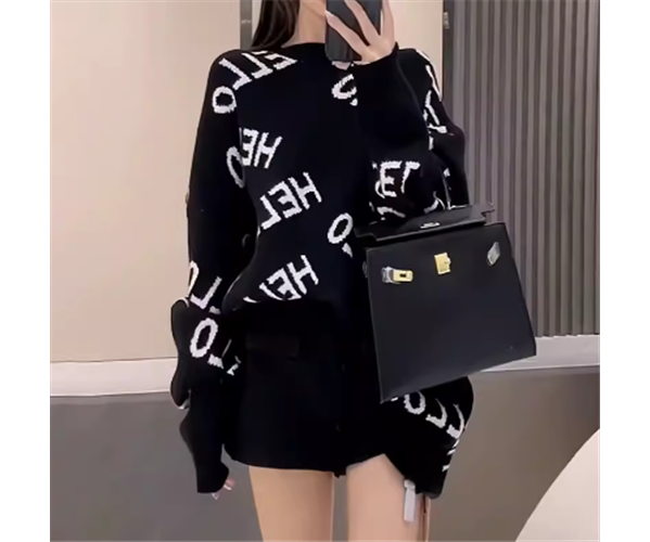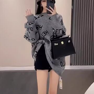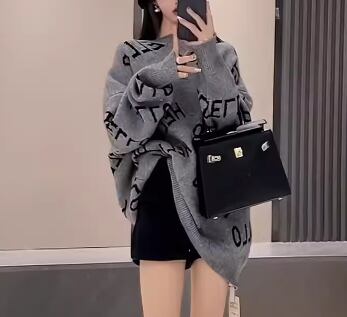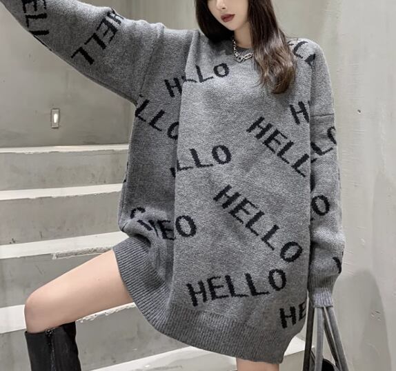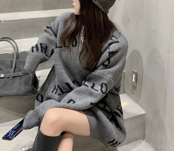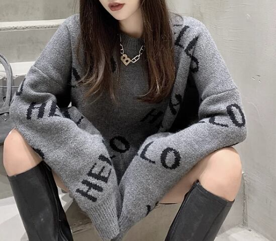 レディース トップス ニット セーター プルオーバー ミドル丈 長袖 ラウンドネック ストレート 厚手 かわいい 大人可愛い カジュアル おしゃれ かっこいい レトロ ラフ ボーイッシュ ルーズ 個性的 クール 存在感 キュート ラグジュアリー ハンサム シック 高級感 スタイリッシュ 文字 テキスト 英語 秋 冬 10代 20代 学校 デート お出かけ 韓国 体型カバー 普段使い 着回し トレンド 流行 S M L XL ゆったり 大きめ ブラック グレー