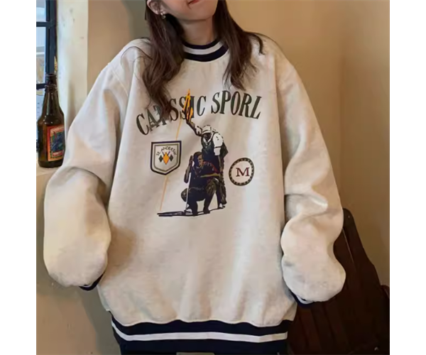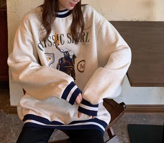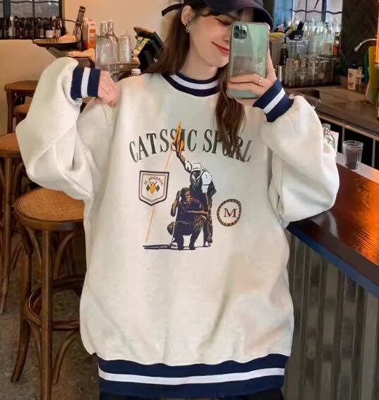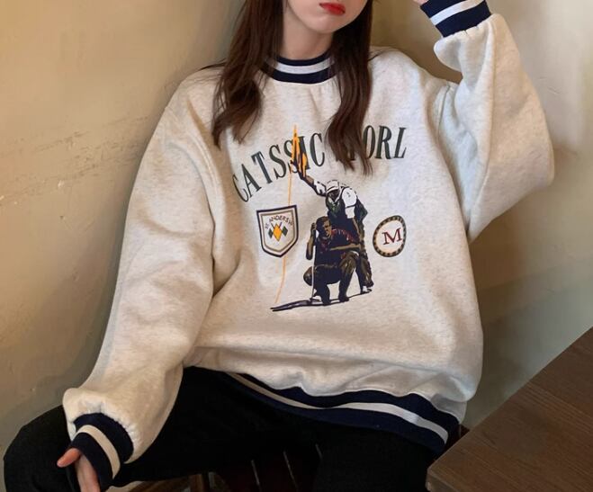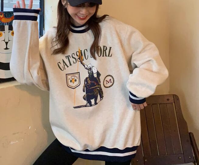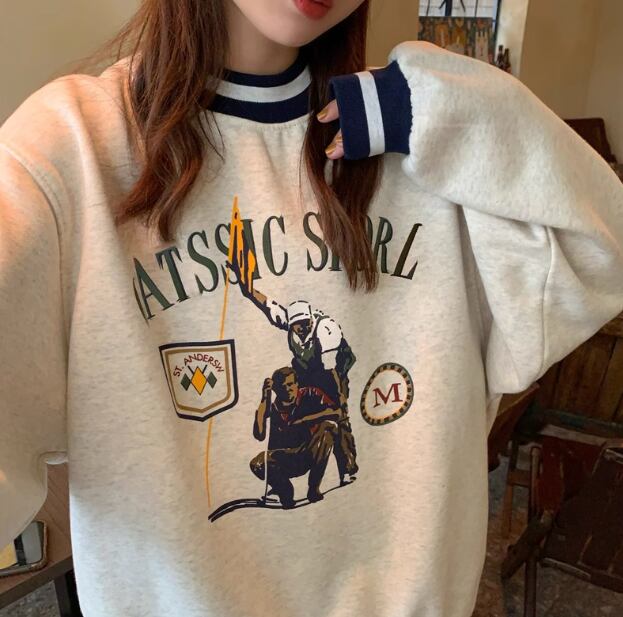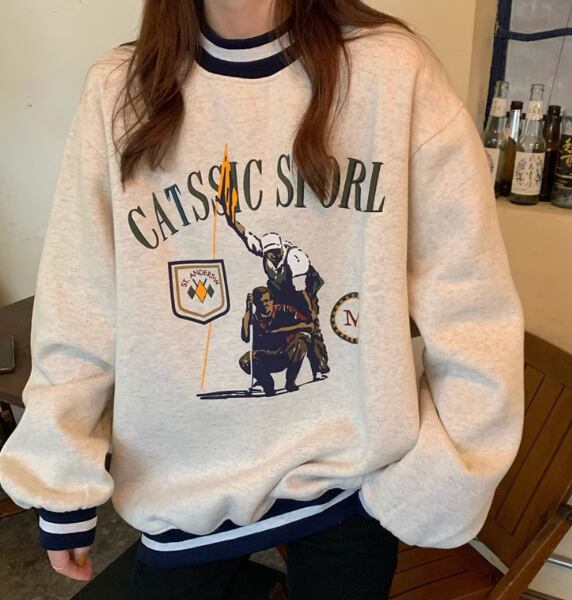 レディース トップス プルオーバー トレーナー スウェット ミドル丈 長袖 ラウンドネック 厚手 コットン ベルベット かわいい 大人可愛い カジュアル おしゃれ かっこいい レトロ メンズライク ボーイッシュ ルーズ クール 存在感 キュート アクティブ リラックス シック スタイリッシュ プリント 秋 冬 10代 20代 学生 デート お出かけ 韓国 暖かい 普段使い 着回し トレンド 流行 M L XL ゆったり ゆる 大きめ オーバーサイズ グレー