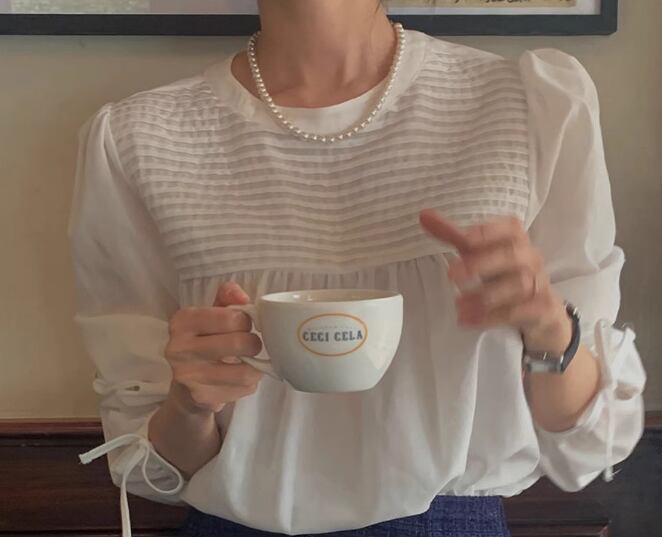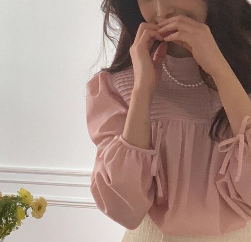 袖の部分にデザインされたリボンが可愛らしい、プルオーバータイプのシフォンシャツ。