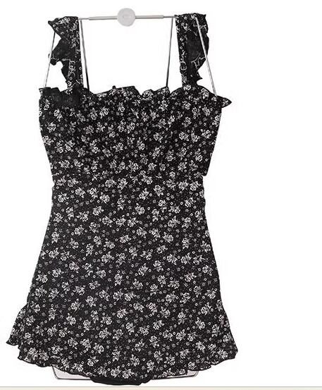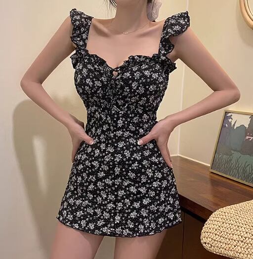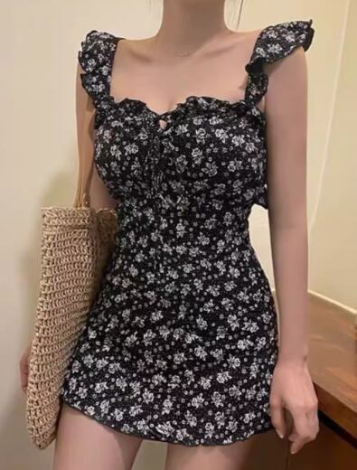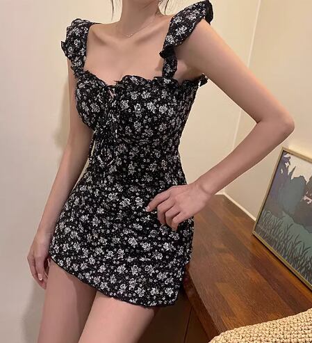 水着 レディース ワンピース 体型カバー ノンワイヤー パッド付き ノースリーブ 袖なし フリル 背中開き バックレス かわいい 大人可愛い きれいめ カジュアル 華やか 大人っぽい おしゃれ お洒落 キュート ガーリー セクシー フェミニン ヘルシー シック 花柄 プリント 小花柄 リゾート 旅行 温泉 プール 夏 海 着痩せ スタイルアップ 背中見せ 体型カバー M L XL Aカップ Bカップ Cカップ ブラック