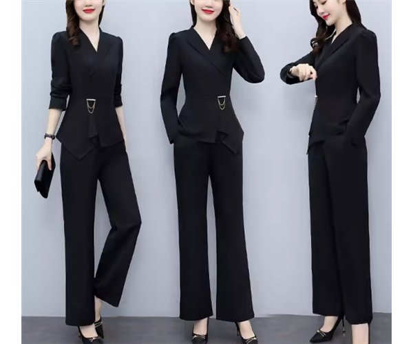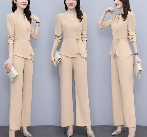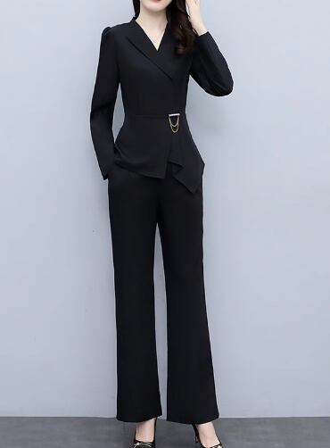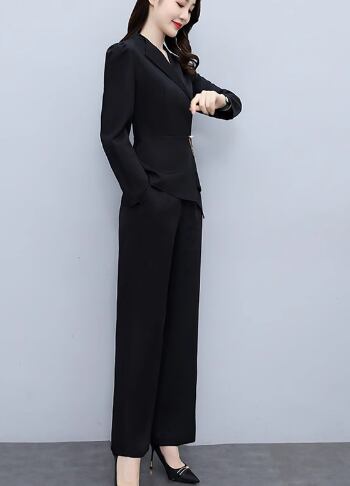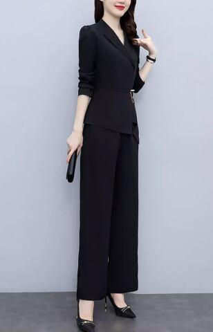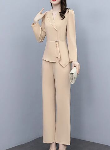 長袖のミドル丈ジャケットとフルレングスのストレートパンツの2点セットです。
