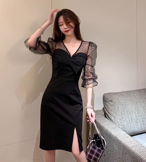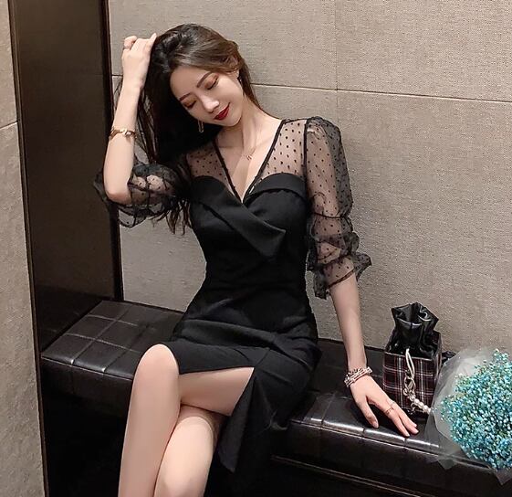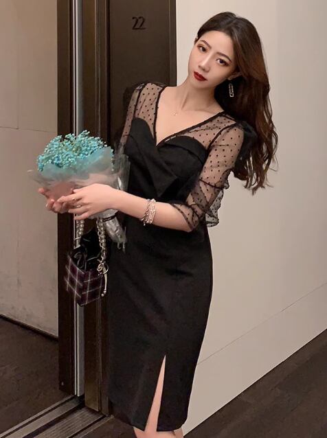 レディース ワンピース ドレス パーティードレス 長袖 Vネック スリム 細身 ストレート 透け感 シースルー かわいい 大人可愛い きれいめ カジュアル 上品 おしゃれ ガーリー ルーズ ラブリー キュート ナチュラル 知的 清潔感 爽やか 華やか ドット柄 オールシーズン パーティー 韓国 オルチャン コーデ モテ 清楚 トレンド 流行 インスタ映え 黒 ブラック