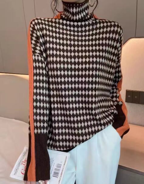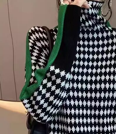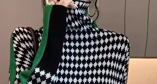 個性的でアーティスティックなデザインが目を引く長袖のタートルネックニットセーター。