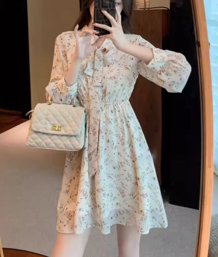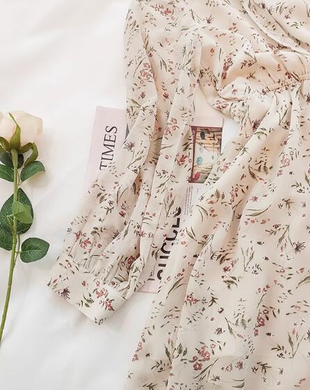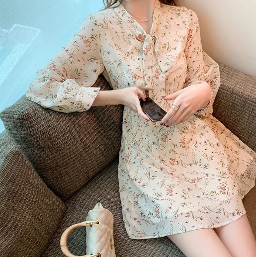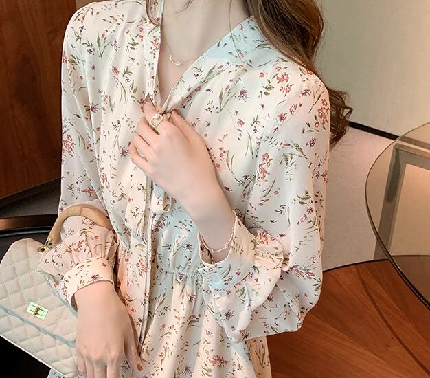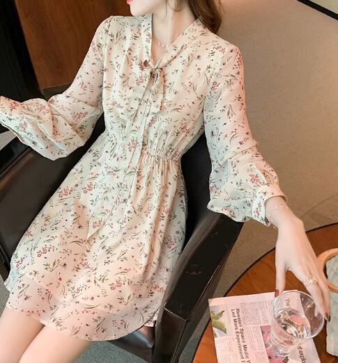 上品で可憐な小花柄模様が可愛い膝上丈のシフォンワンピース。
