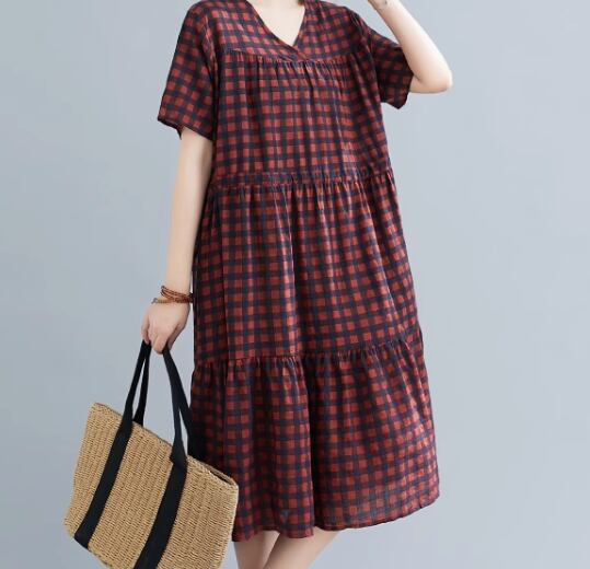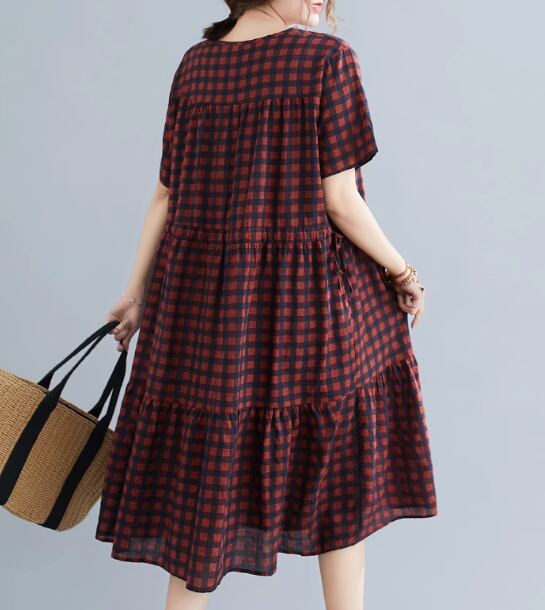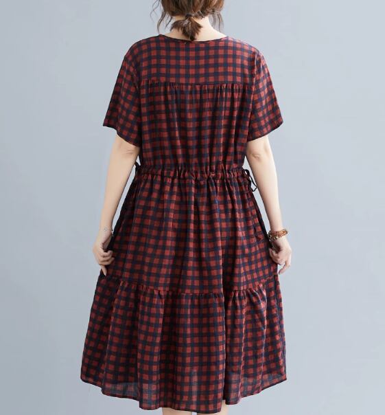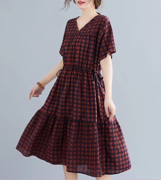 レディース ワンピース プルオーバー 膝丈 ミモレ 半袖 Vネック フリル ウエストゴム かわいい 大人可愛い シンプル カジュアル レトロ ラフ ガーリー ルーズ 存在感 キュート ナチュラル リラックス シック 高級感 優しい 穏やか チェック 夏 デート お出かけ 楽ちん 体型カバー M L XL ゆったり ゆる 大きめ オーバーサイズ ゆったりウエスト ホワイト レッド