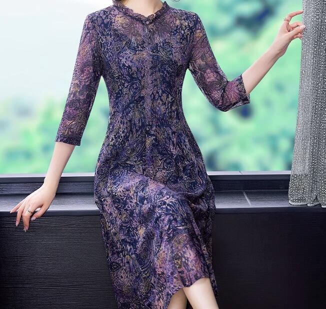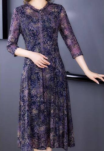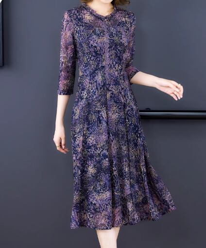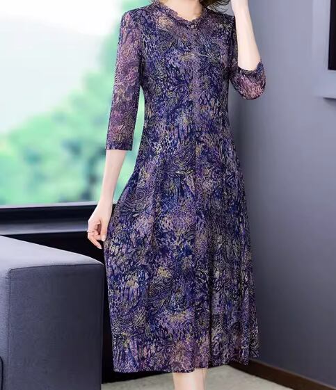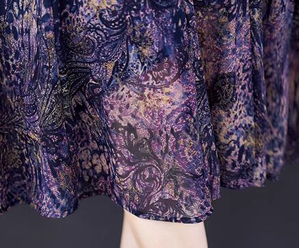 レディース ワンピース プルオーバー ドレス ミモレ 7分袖 フレア Aライン フリル メッシュ 大人可愛い きれいめ 上品 おしゃれ レトロ 個性的 エレガント 存在感 ラグジュアリー シック 高級感 芸術的 アーティスティック 華やか プリント ペイズリー 秋 ママ ミセス デート お出かけ パーティー イベント 普段使い L XL 大きいサイズ パープル 大人デザイン