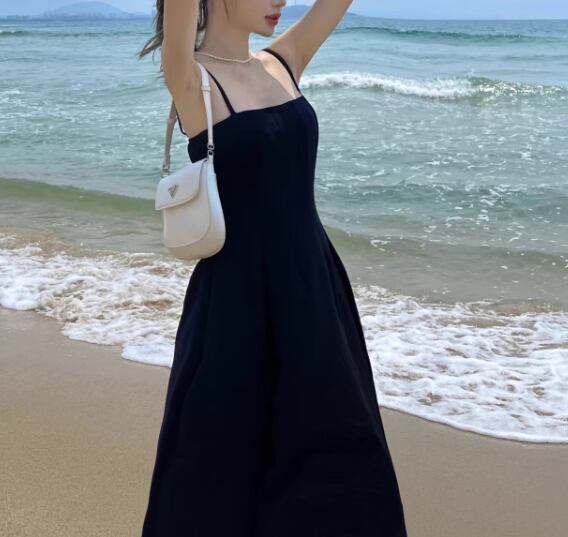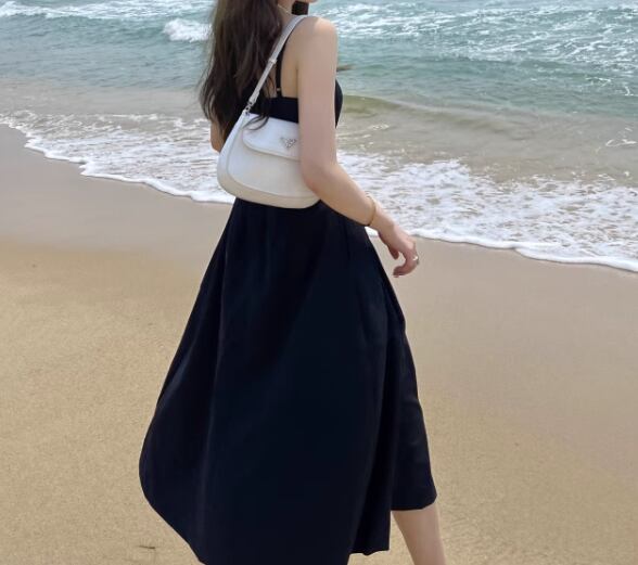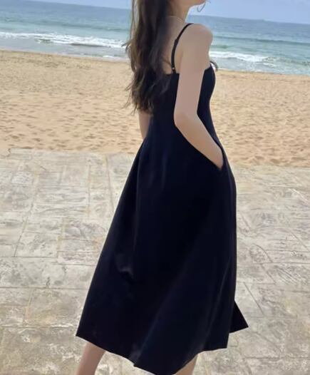 クールなブラック×Aラインシルエットが大人可愛いノースリーブのミモレ丈ドレス。