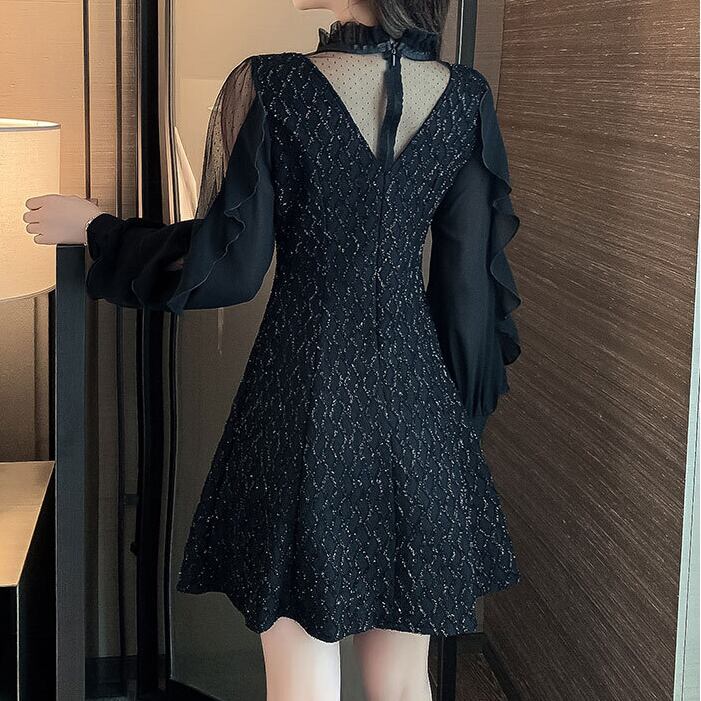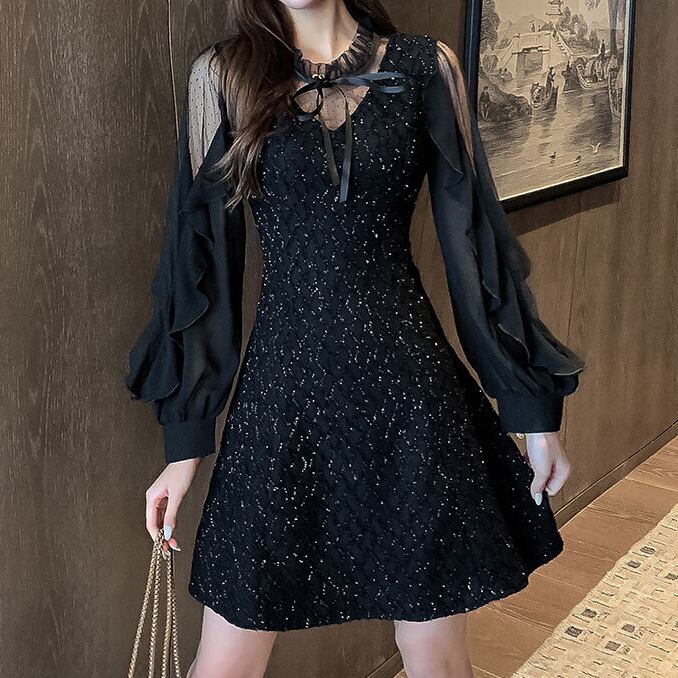 レディース ワンピース ドレス ミニ 長袖 萌袖 フリル袖 ラウンドネック 襟なし りぼんタイ 肌見せ Aライン レース シフォン フリル リボン ファスナー ハイウエスト 透け感 シースルー 肌見せ かわいい おしゃれ ガーリー 主役級 存在感 ラブリー キュート ドット柄 パーティー 脚長 S M L XL 2XL ブラック