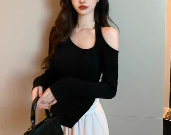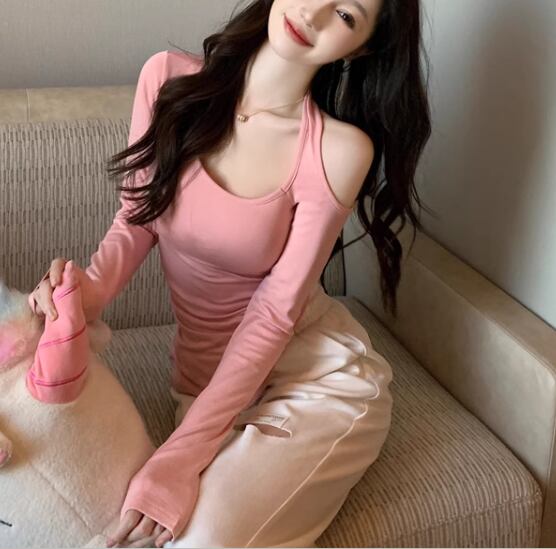 レディース トップス カットソー プルオーバー Tシャツ ミドル丈 左右非対称 不規則 長袖 ホルターネック ワンショルダー 肌見せ 肩出し タイト スリム 細身 スリット 厚手 大人可愛い きれいめ シンプル カジュアル おしゃれ かっこいい こなれ感 ラフ クール 抜け感 ラグジュアリー セクシー シック 高級感 スタイリッシュ 無地 春 10代 20代 学生 デート お出かけ 普段使い 着回し フリーサイズ 小さめ ホワイト ブラック ピンク