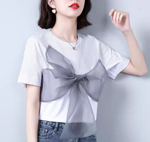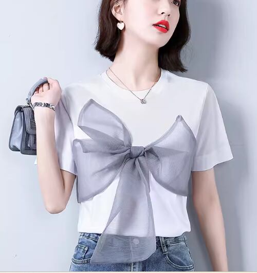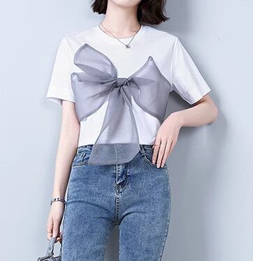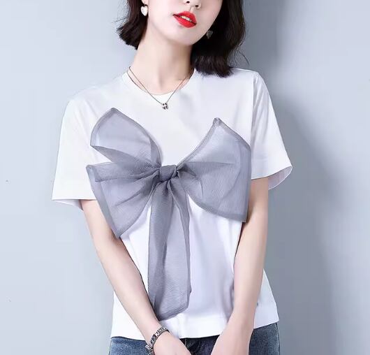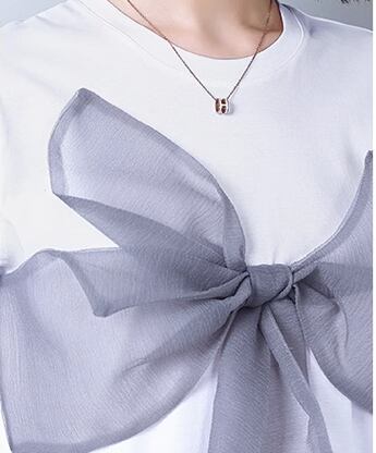 レディース トップス カットソー プルオーバー Tシャツ ミドル丈 半袖 ラウンドネック リボン かわいい 大人可愛い シンプル カジュアル おしゃれ ラフ ルーズ 個性的 存在感 キュート ラグジュアリー 清潔感 爽やか シック 高級感 芸術的 アーティスティック 涼しげ プリント リボン柄 夏 デート お出かけ 体型カバー 普段使い 着回し S M L XL ゆったり ホワイト
