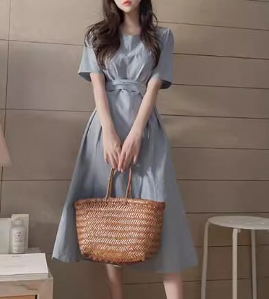 優しげなくすみカラーとシンプルで洗練されたデザインが大人可愛い半袖のミモレ丈ワンピース。