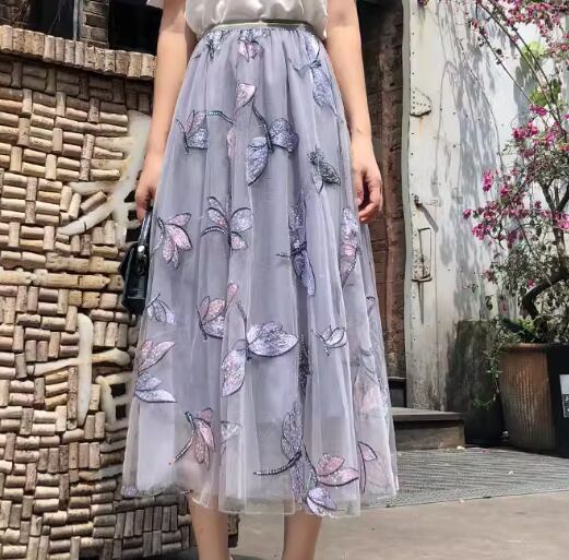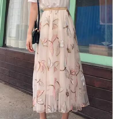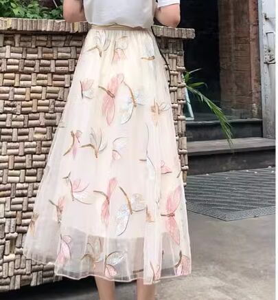 レディース スカート チュールスカート ミモレ ロング Aライン フェミニン 刺繍 チュール ハイウエスト ウエストゴム スパンコール かわいい 大人可愛い きれいめ カジュアル 上品 おしゃれ ガーリー 個性的 エレガント ラブリー キュート 清潔感 シック 高級感 芸術的 アーティスティック 優しい 穏やか フェアリー とんぼ柄 夏 デート お出かけ 楽ちん 普段使い 着回し モテ 清楚 S M L XL アプリコット グレーブルー