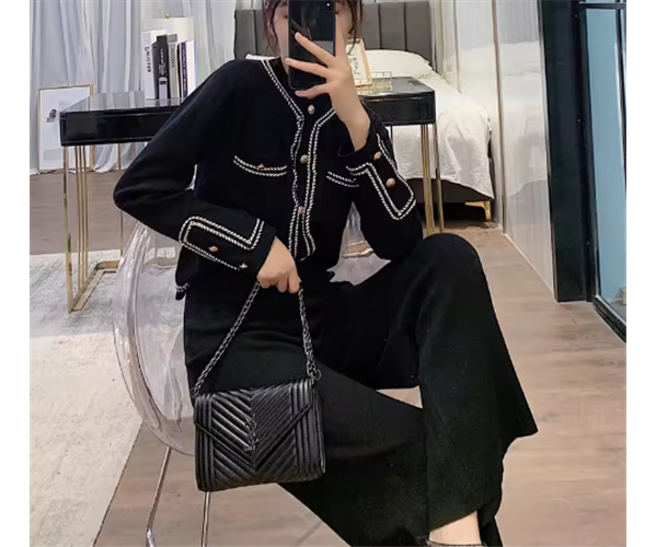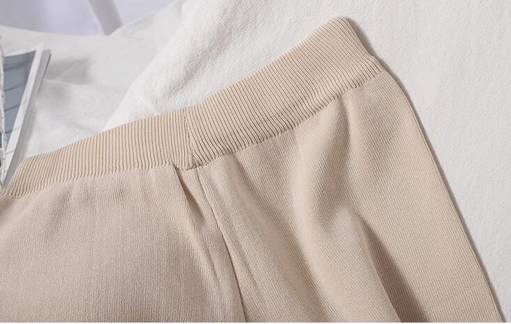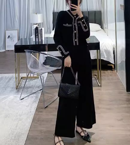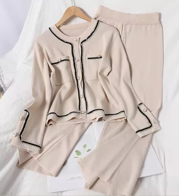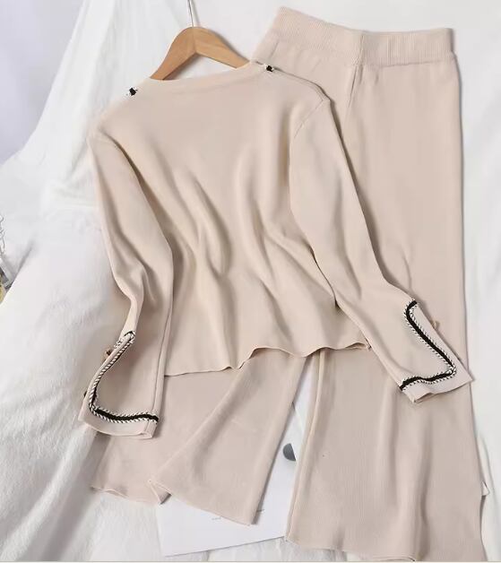 ショート丈の長袖ニットカーディガンとフルレングスのニットパンツの2点セットです。