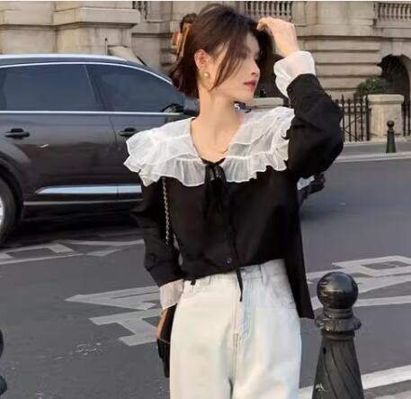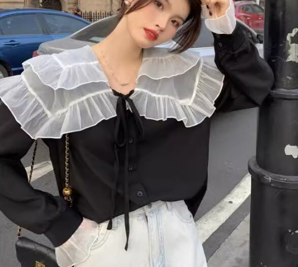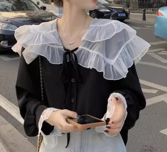 レディース トップス シャツ ミドル丈 長袖 襟付き フリル リボン 異国風 かわいい クラシカル 大人可愛い きれいめ カジュアル 上品 おしゃれ レトロ ガーリー 個性的 エレガント 存在感 ラブリー キュート ラグジュアリー シック 高級感 華やか 優しい 穏やか フェアリー 無地 春 10代 20代 学生 デート お出かけ モノトーン 普段使い 着回し L XL 大きいサイズ ブラック