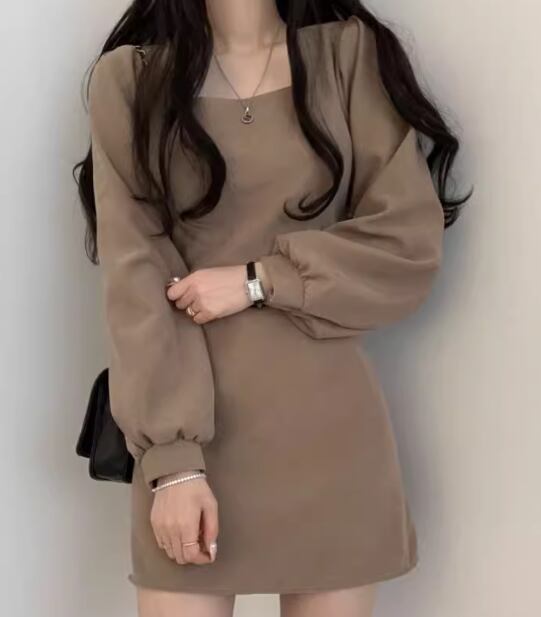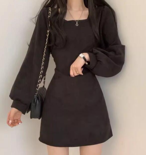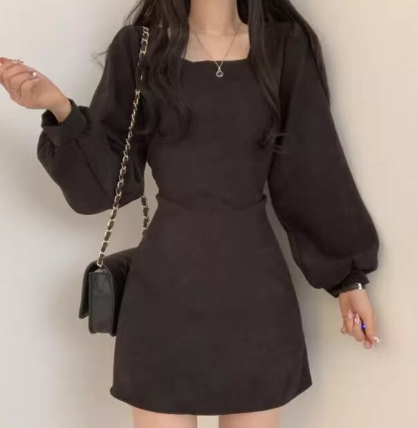 シックなカラーとシンプルで洗練されたデザインが大人可愛い長袖のショート丈ワンピース。