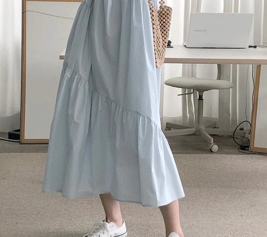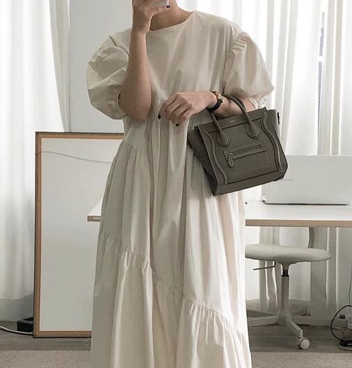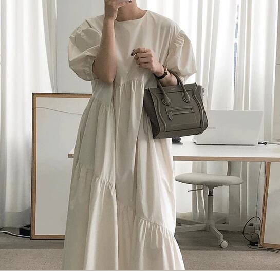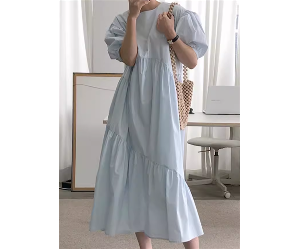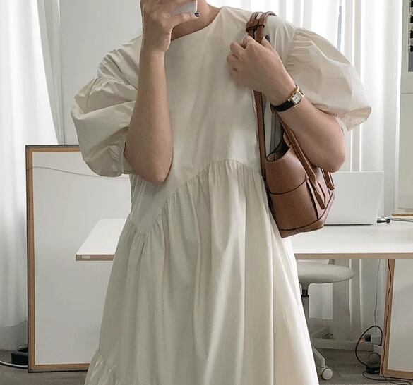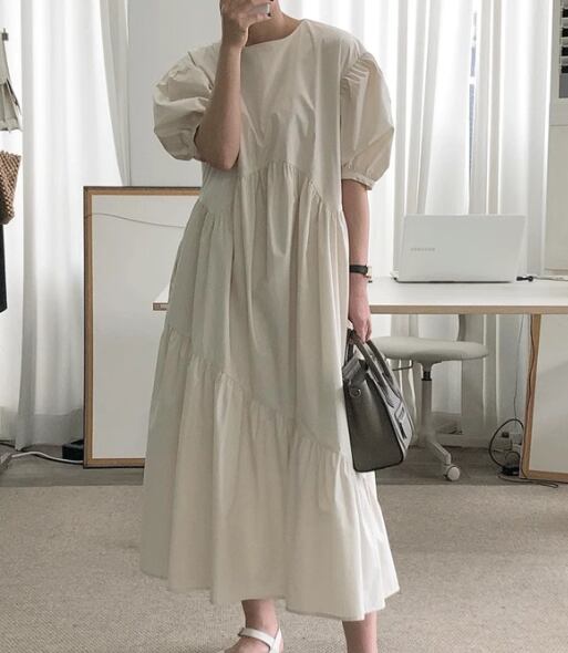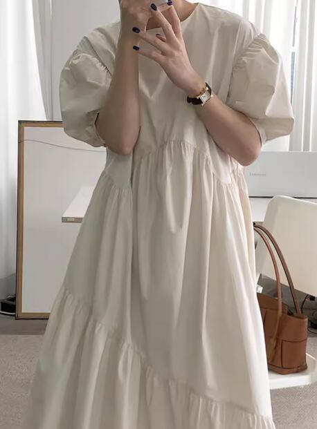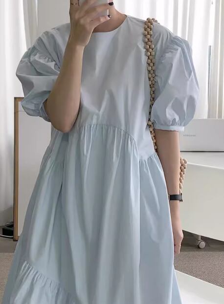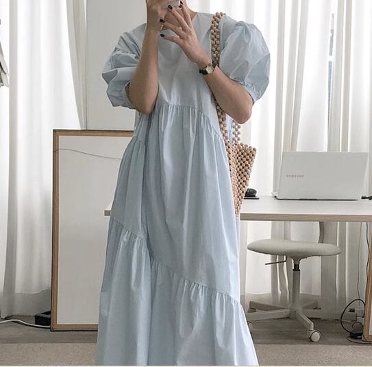 レディース ワンピース プルオーバー ロング 半袖 パフスリーブ ラウンドネック 切り替えデザイン シンプル カジュアル レトロ ラフ ルーズ ナチュラル リラックス シック 高級感 優しい 穏やか 無地 夏 デート お出かけ 韓国 楽ちん 体型カバー 普段使い S M L XL ゆったりウエスト ブルー アプリコット