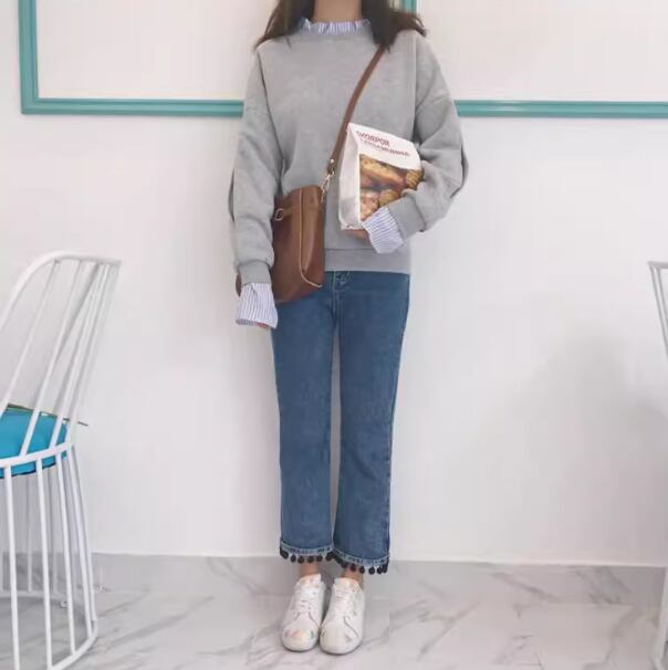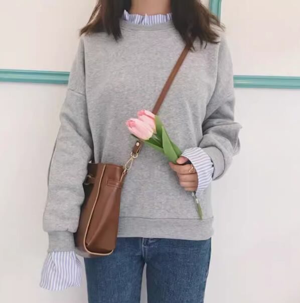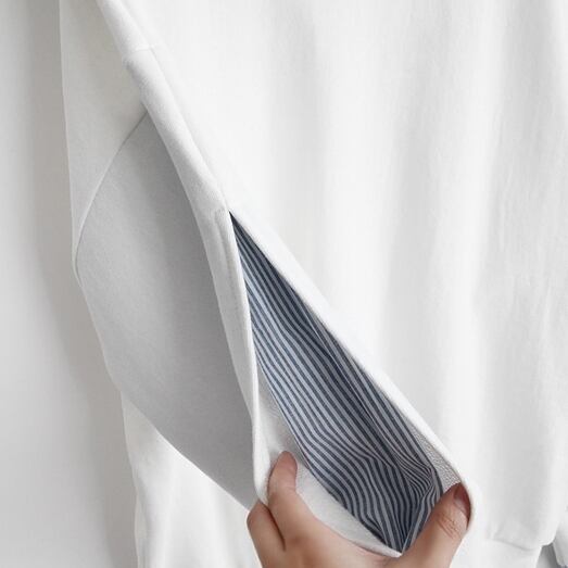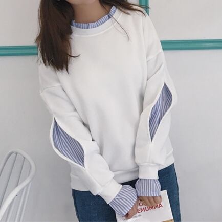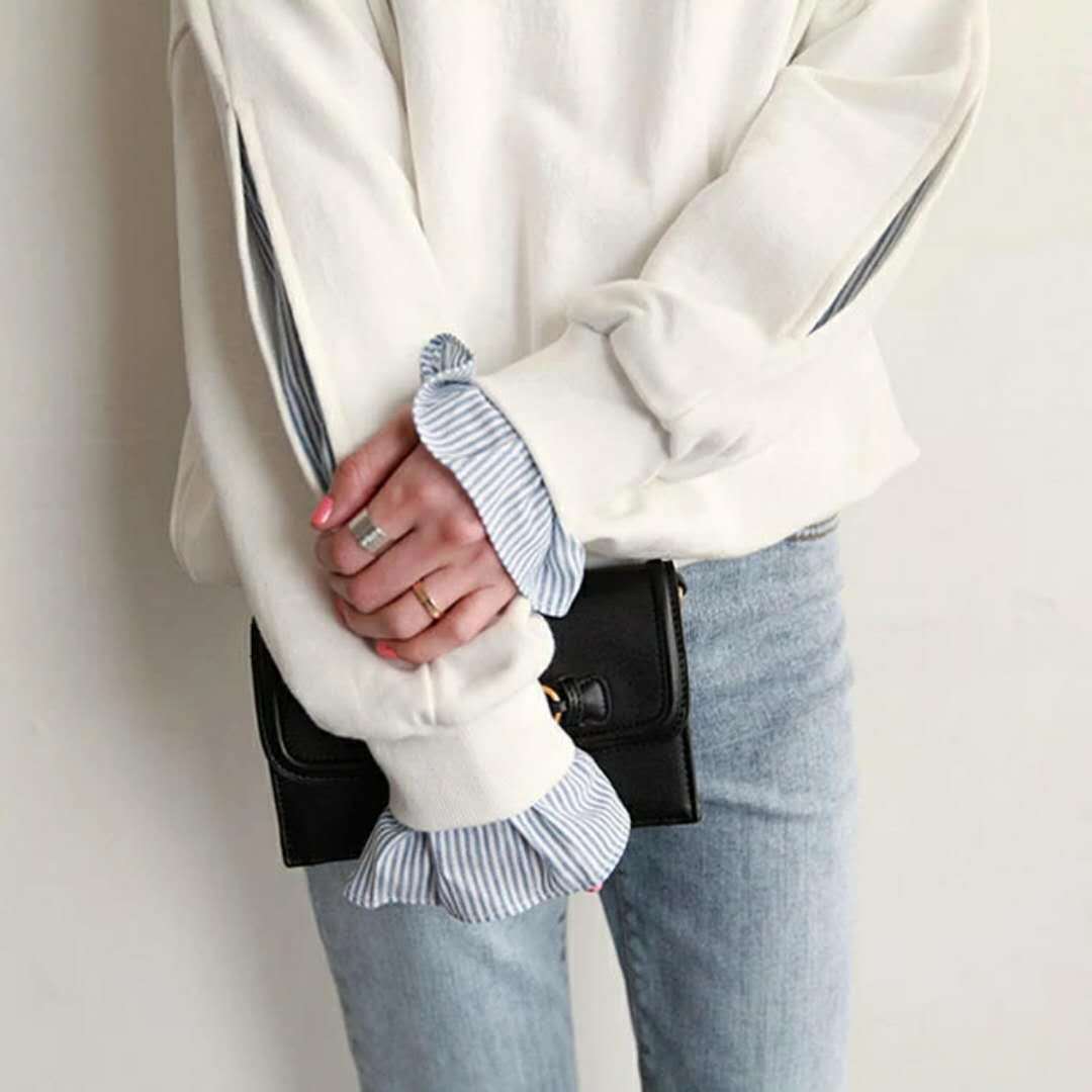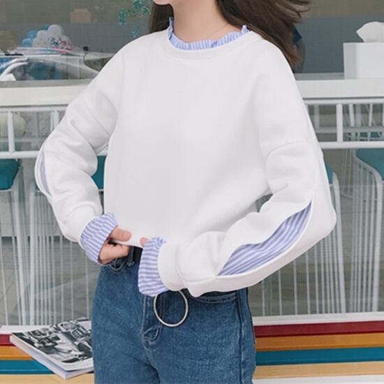 重ね着風 フェイクレイヤード レディース トップス プルオーバー トレーナー ミドル丈 長袖 萌袖 フリル袖 ラウンドネック 切り替え ドッキング フリル スリット 切り替えデザイン バイカラー 異素材ミックス かわいい カジュアル おしゃれ こなれ感 ラフ ガーリー 個性的 存在感 キュート ストライプ 春 秋 冬 お出かけ 公園 休日 重ね着 楽ちん 普段使い M L XL 2XL ゆったり ホワイト グレー