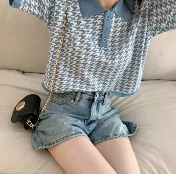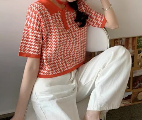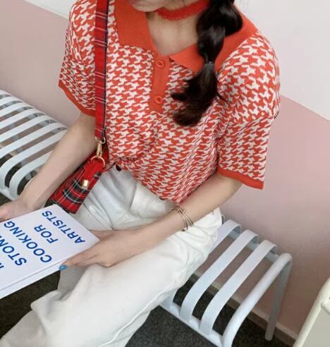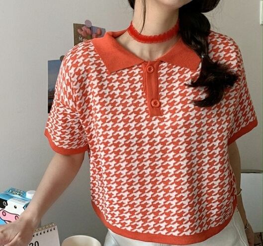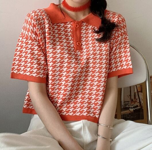 レディース トップス サマーニット Tシャツ ショート 半袖 襟付き ポロカラー スリム バイカラー ニット かわいい 大人可愛い カジュアル こなれ感 個性的 主役級 存在感 キュート 千鳥格子 春 夏 デート お出かけ 女子会 S M L XL オレンジ ブルー