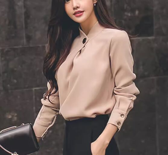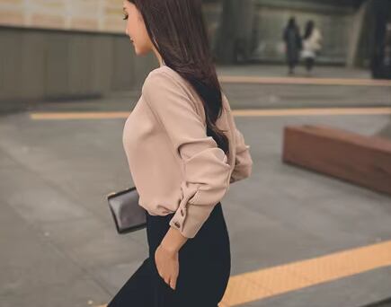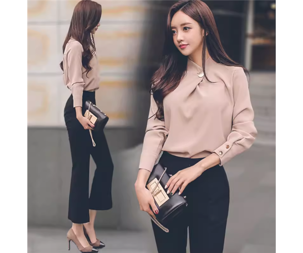 ベージュの長袖のシフォンシャツと黒のフルレングスパンツの2点セットです。
