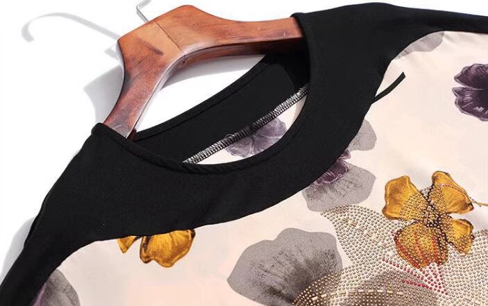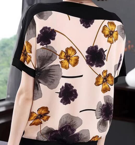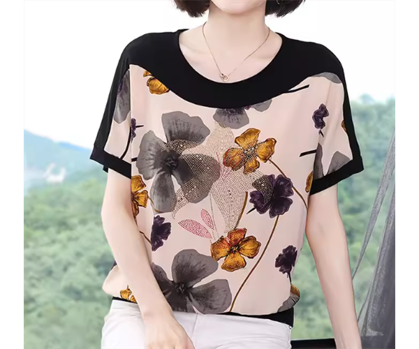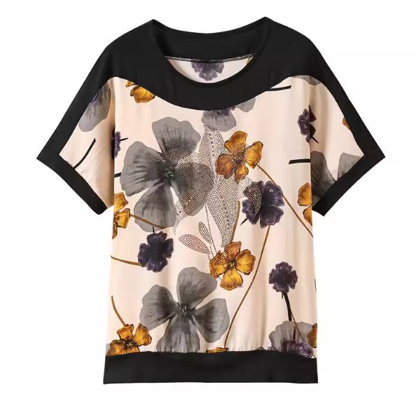 シックな色使いと華やかなボタニカルプリントが魅力的な半袖Tシャツ。