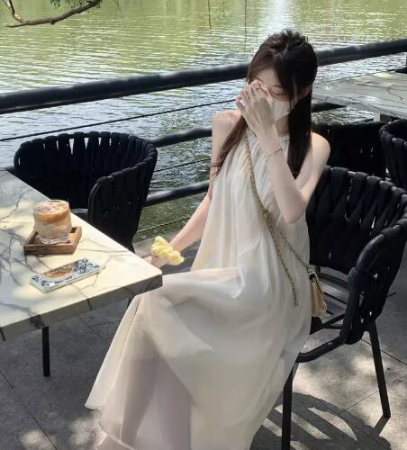 女性らしいAラインシルエットと涼しげなデザインが可愛いノースリーブのロングワンピース。