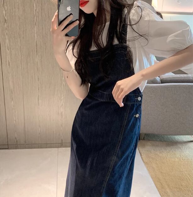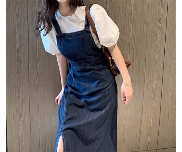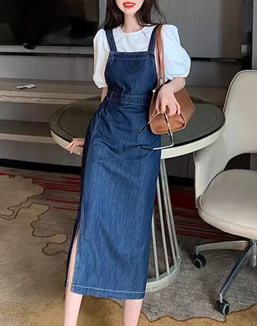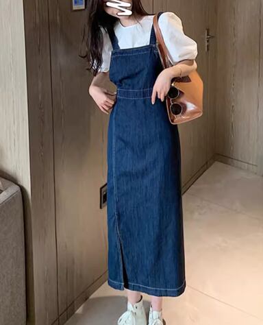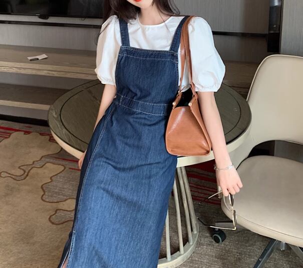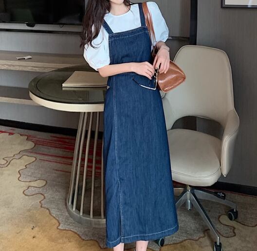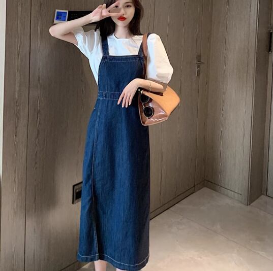 二点セット ツーピース レディース トップス ワンピース プルオーバー デニム デニムワンピース ジャンパースカート Tシャツ ミモレ ロング 半袖 ラウンドネック スリット 異国風 かわいい 大人可愛い きれいめ シンプル カジュアル 上品 おしゃれ レトロ ガーリー キュート ナチュラル 清潔感 爽やか シック 高級感 スタイリッシュ 無地 春 夏 デート お出かけ 重ね着 体型カバー 普段使い 着回し レイヤード 清楚 S M L XL ホワイト ブルー