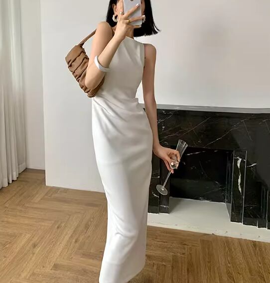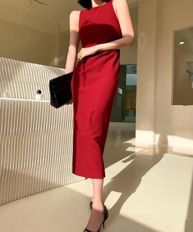 レディース ドレス ウェディング パーティー 結婚式 二次会 披露宴 演奏会 ミモレ ロング 袖なし ノースリーブ ラウンドネック クルーネック スレンダー スリム 細身 Aライン きれいめ シンプル 大人可愛い 上品 おしゃれ かっこいい クール エレガント セクシー シック ナチュラル 高級感 セレブリティ こなれ感 無地 イベント ホテル レストラン デート 食事会 会食 女子会 夏 S M L XL 小さめ ホワイト ブラック レッド