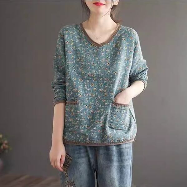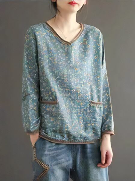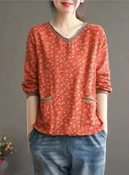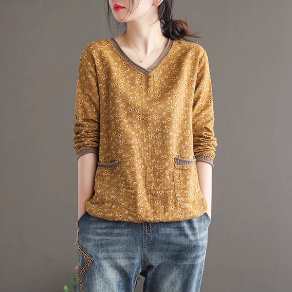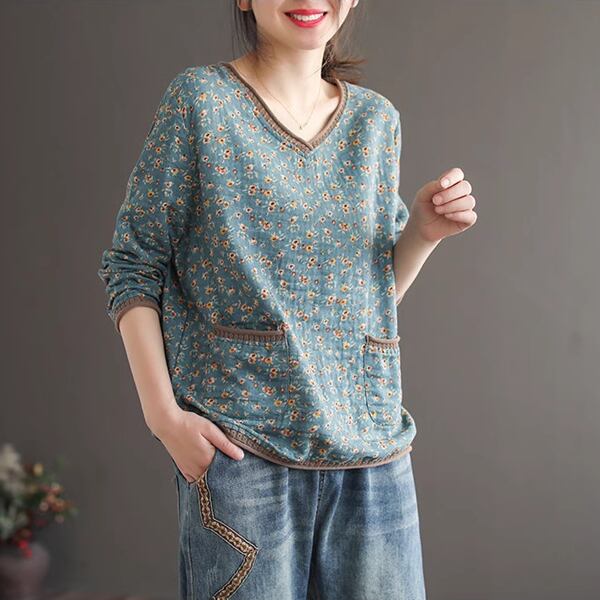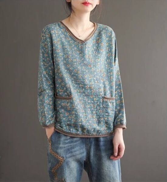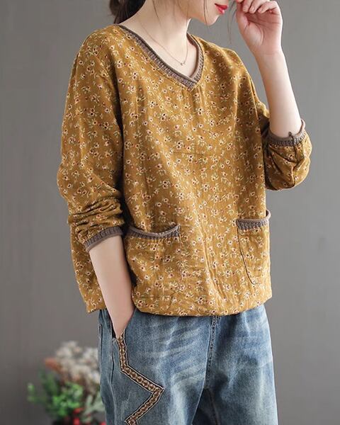 レトロな魅力が詰まった花柄長袖Tシャツ。ボトリングシャツのデザインに、レトロなVネックとポケットが特徴です。華やかな花柄がアクセントで、個性的なスタイルを演出します。春の装いにぴったり。デイリーコーディネートにも活躍し、着心地の良さも魅力です。トレンド感とレトロな雰囲気を兼ね備えた一枚で、ファッションのアクセントとしておすすめします。