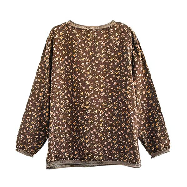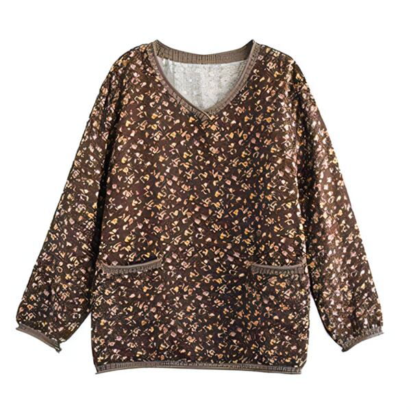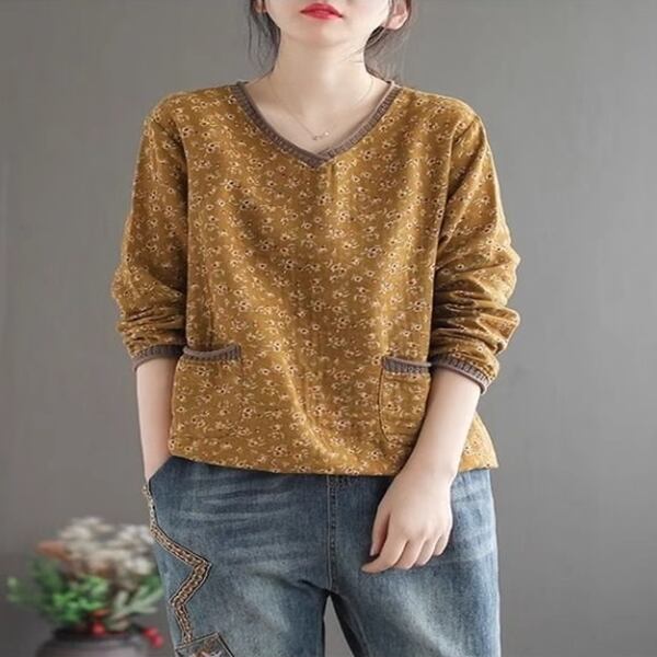 4カラーレトロな花柄Tシャツ/ボトリングシャツ レディース トップス ロンT カットソー 上着 Tシャツ ミドル丈 長袖 Vネック 襟なし ノーカラー ストレート ポケット ラミー 大人可愛い カジュアル おしゃれ ルーズ 花柄 小花柄 春 夏 秋 シーズンレス OL 通勤 通学 デート カフェ 普段使い ブラウン イエロー オレンジ ブルー