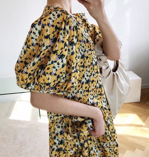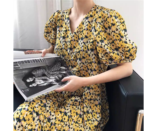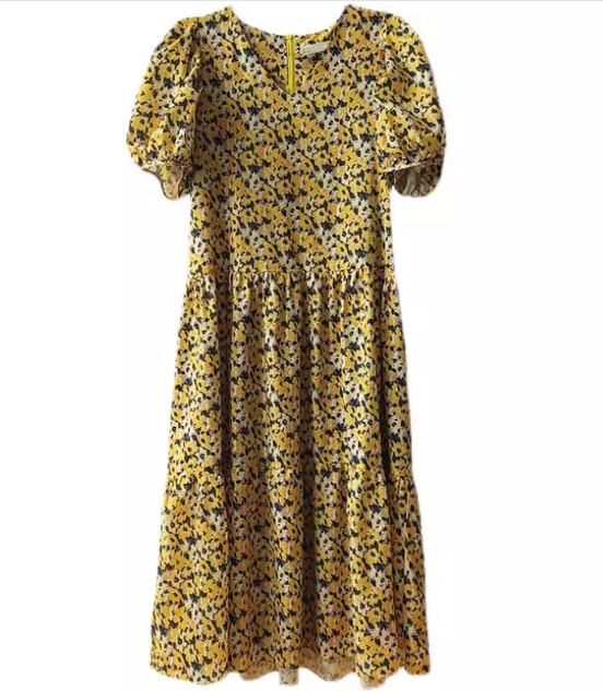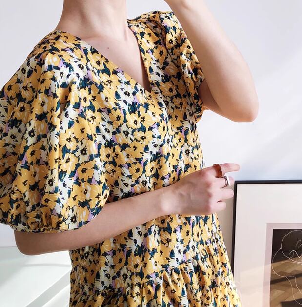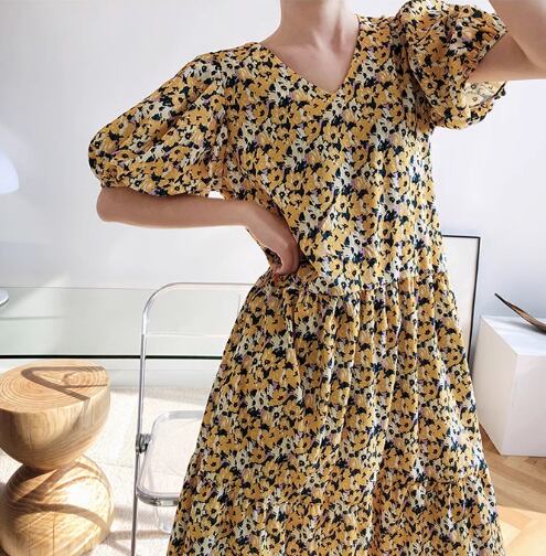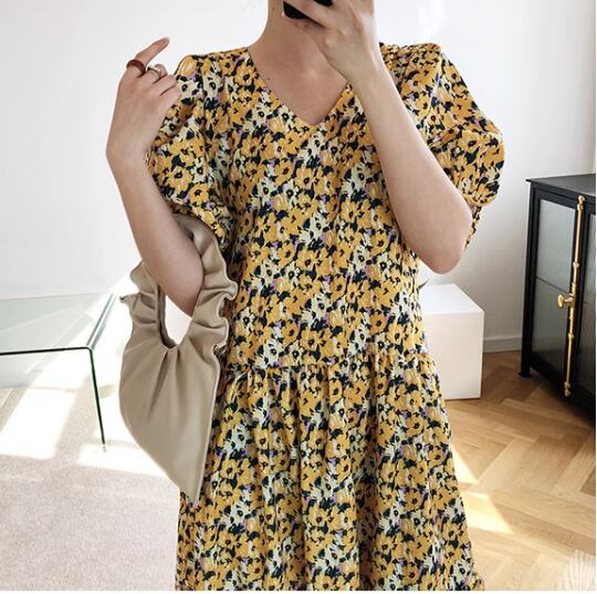 レディース ワンピース プルオーバー ミモレ ロング 半袖 ボリューム袖 Vネック フェミニン ファスナー かわいい 大人可愛い きれいめ カジュアル 上品 おしゃれ レトロ ラフ ガーリー ルーズ エレガント 主役級 存在感 キュート 高級感 華やか 優しい 穏やか フェアリー 花柄 フラワー プリント 夏 デート お出かけ 楽ちん 体型カバー 普段使い 清楚 M L ゆったり ゆったりウエスト イエロー