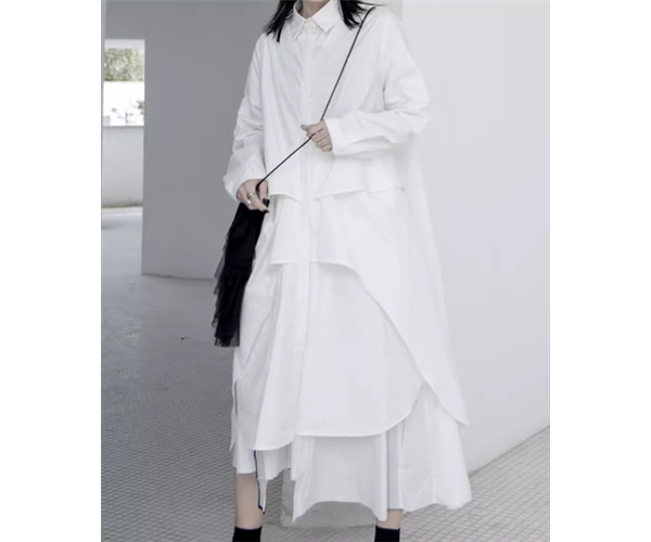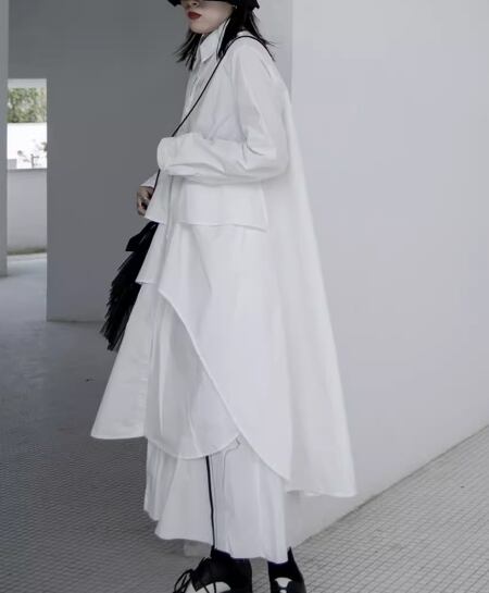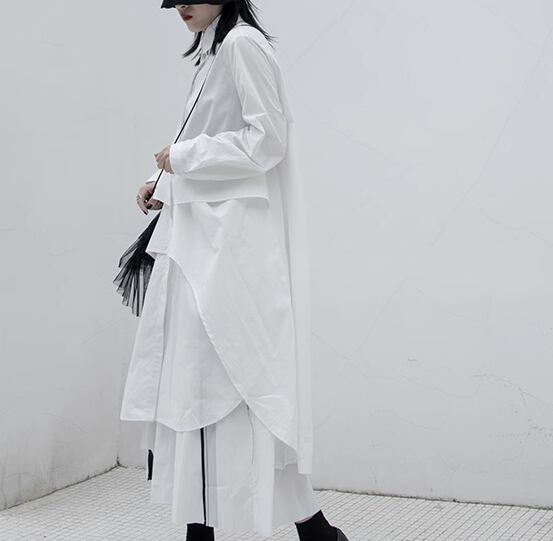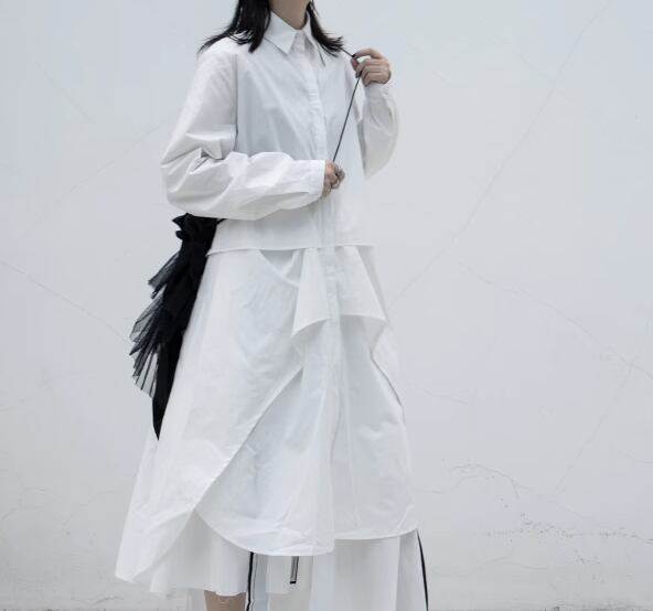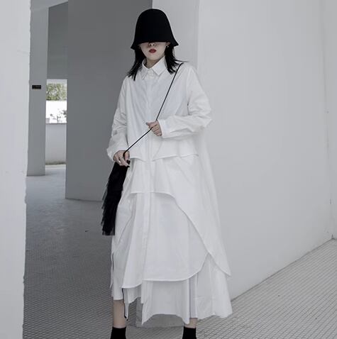 レディース ワンピース シャツワンピ ロング 左右非対称 イレギュラー 不規則 長袖 襟付き ポロカラー Aライン 前開き ボタン 大人可愛い カジュアル おしゃれ かっこいい ルーズ 個性的 クール モード系 存在感 ゴシック ラグジュアリー ロック リラックス ハンサム シック 高級感 芸術的 アーティスティック スタイリッシュ 無地 春 秋 デート お出かけ モノトーン 韓国 体型カバー ゆったり フリーサイズ ゆったりウエスト ホワイト ブラック