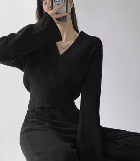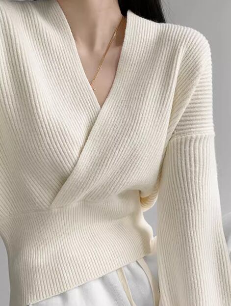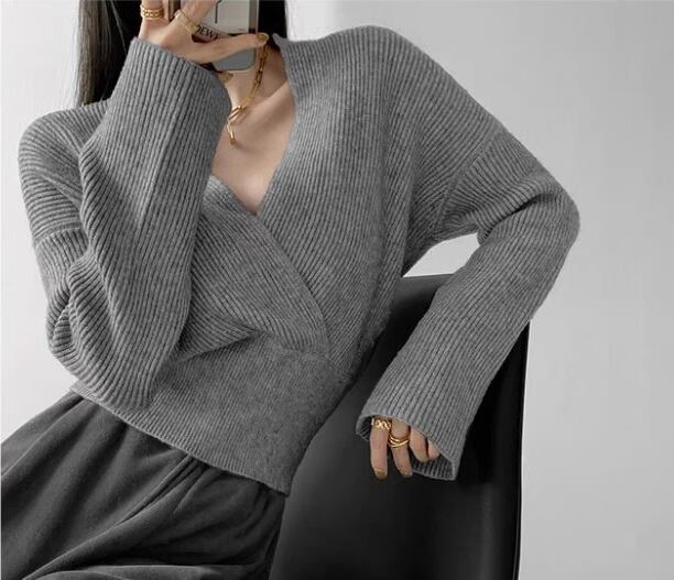 シックなカラーとカシュクールデザインが大人可愛いショート丈のニットセーター。