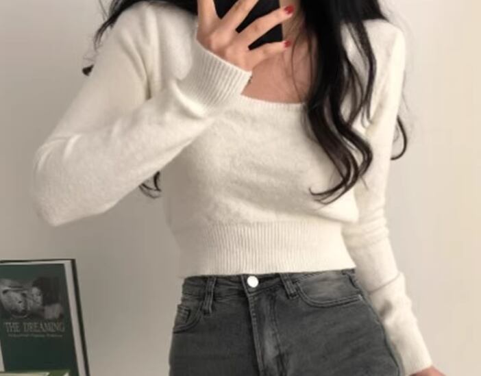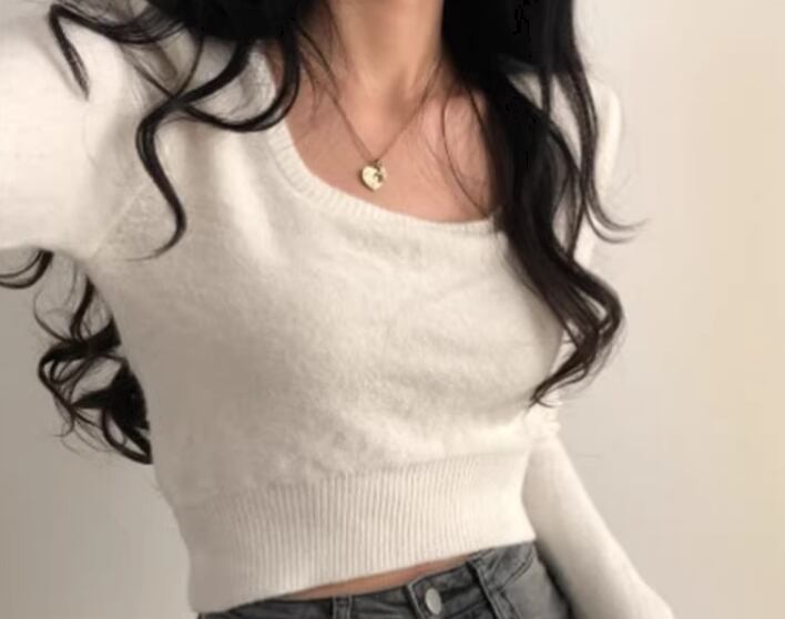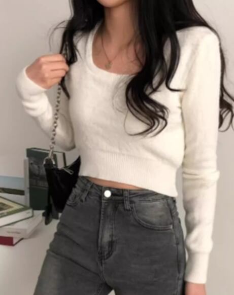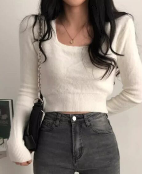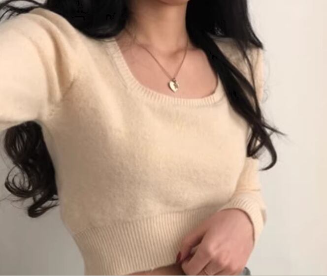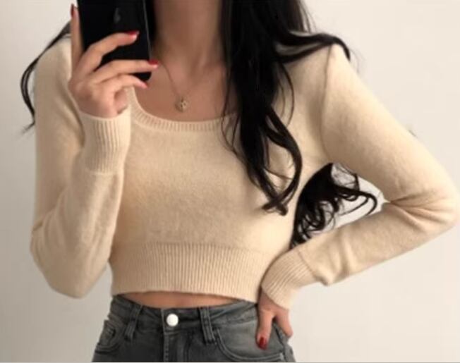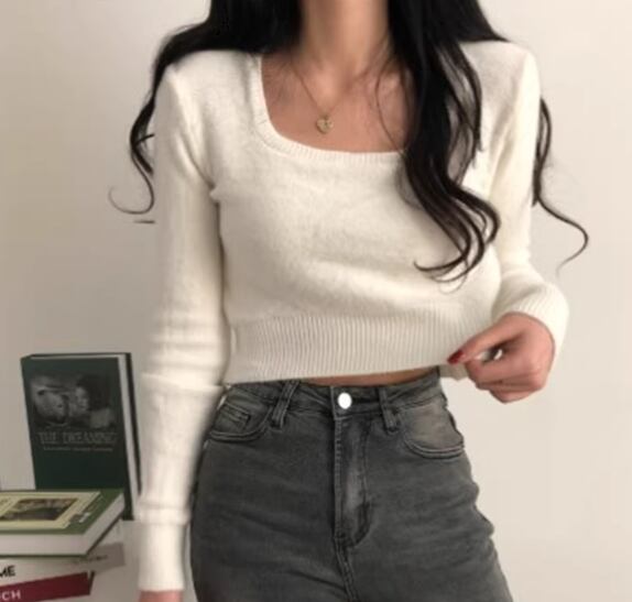 レディース トップス ニット セーター プルオーバー ショート 長袖 スクエアネック タイト スリム 細身 大人可愛い きれいめ シンプル カジュアル おしゃれ かっこいい こなれ感 ラフ クール 抜け感 ラグジュアリー セクシー ハンサム シック スタイリッシュ 無地 秋 デート お出かけ 韓国 普段使い 着回し トレンド 流行 フリーサイズ 小さめ フィット ホワイト ブラック アプリコット