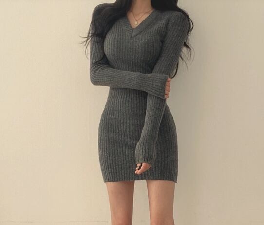 レディース ワンピース ニットワンピ ミニ ショート 長袖 Vネック タイト スリム 細身 スマート フィット ハイウエスト 大人可愛い シンプル カジュアル おしゃれ かっこいい こなれ感 クール エレガント ラグジュアリー セクシー シック 高級感 スタイリッシュ 無地 春 秋 デート お出かけ 韓国 普段使い モテ S M L 小さめ ブラック グレー アプリコット