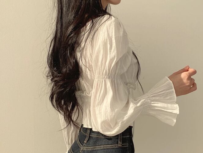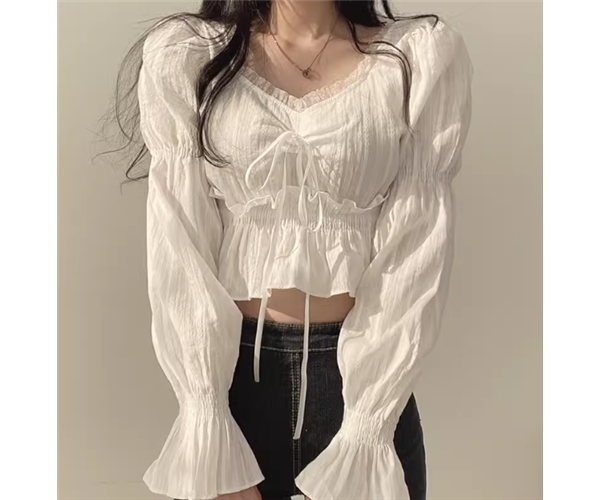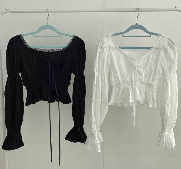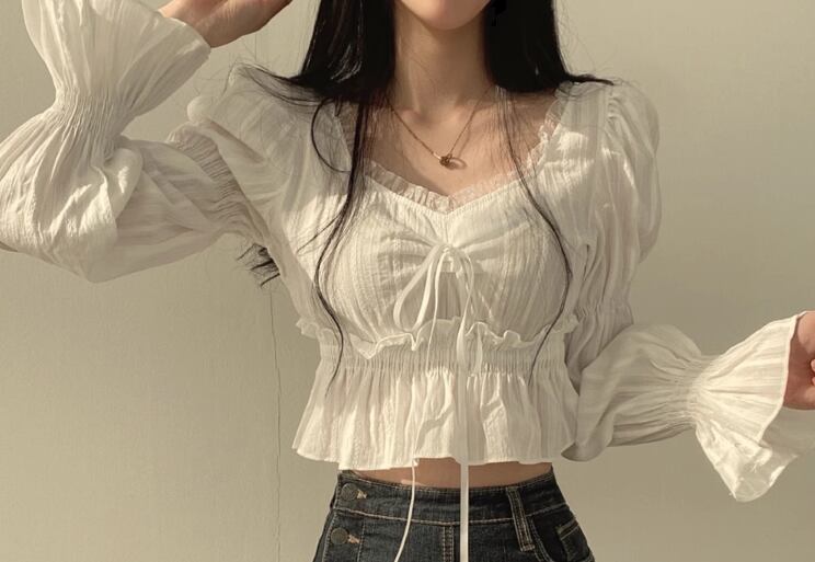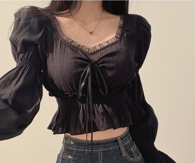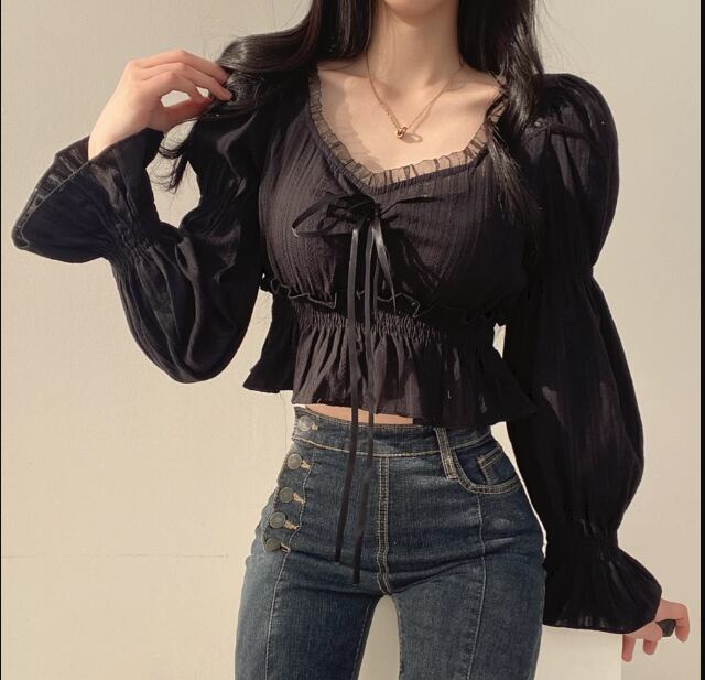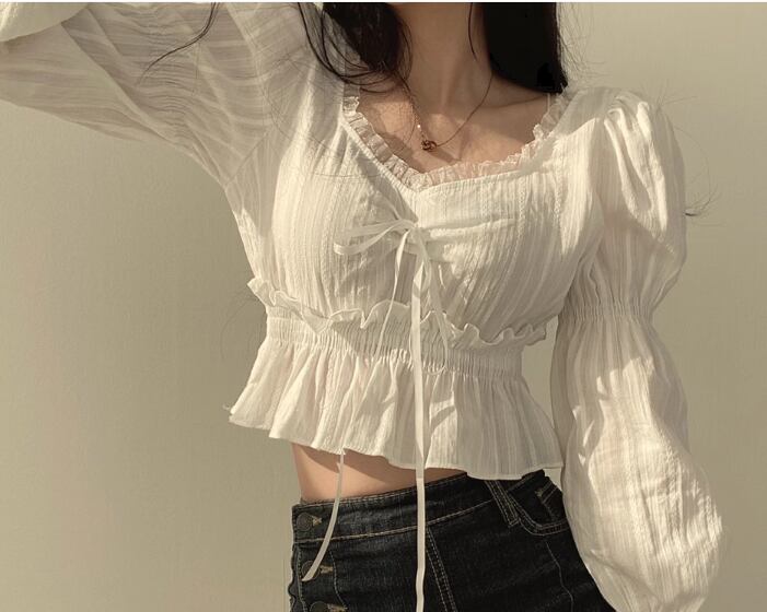 レディース トップス シャツ カットソー プルオーバー ショート 長袖 ボリューム袖 パフスリーブ Vネック スクエアネック スリム 細身 フェミニン レース フリル リボン かわいい 大人可愛い シンプル カジュアル おしゃれ ラフ ガーリー 個性的 抜け感 キュート ラグジュアリー アクティブ シック 高級感 スタイリッシュ フェアリー 無地 春 夏 秋 デート お出かけ 韓国 普段使い 着回し モテ フリーサイズ 小さめ ホワイト ブラック