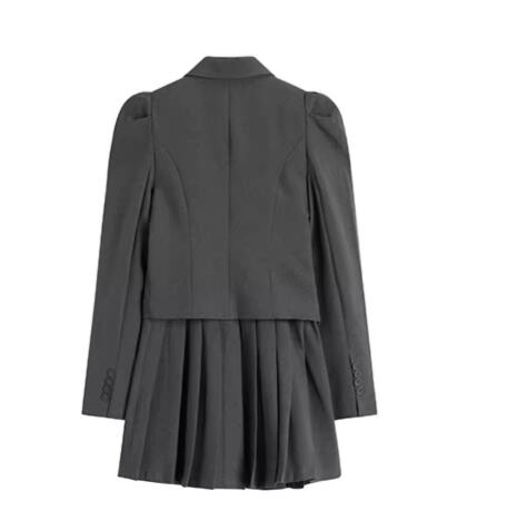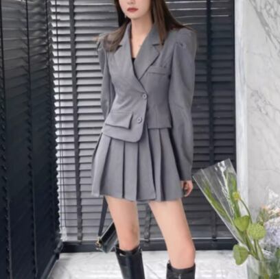 ジャケットスーツ風の上半身のアシンメトリーデザインとスカートのきれいなプリーツが魅力的なアイテムです。