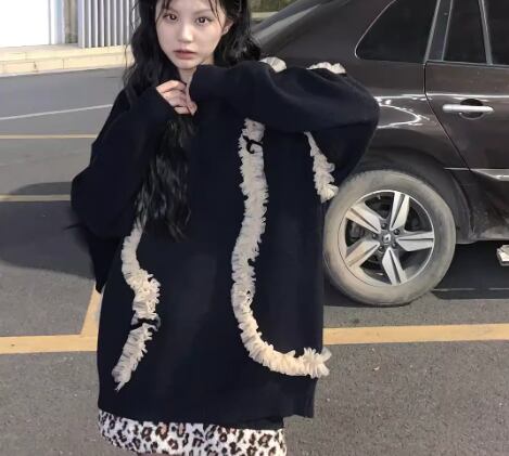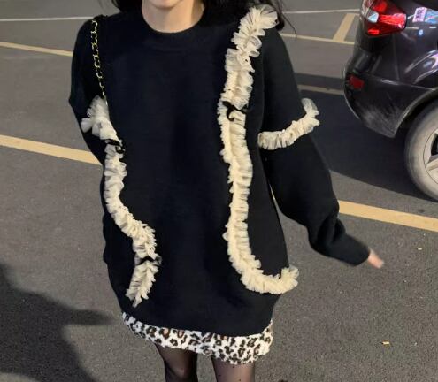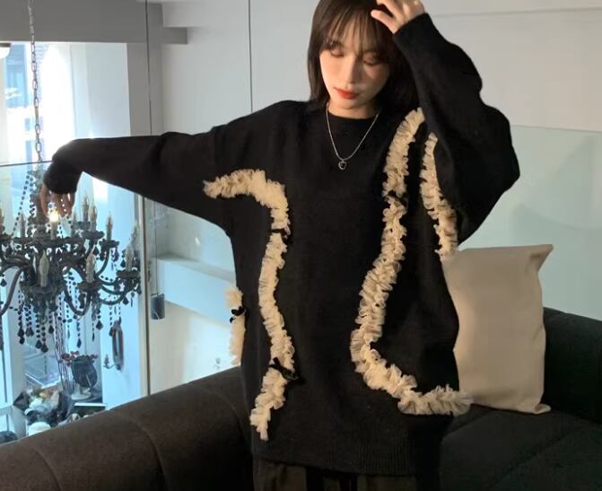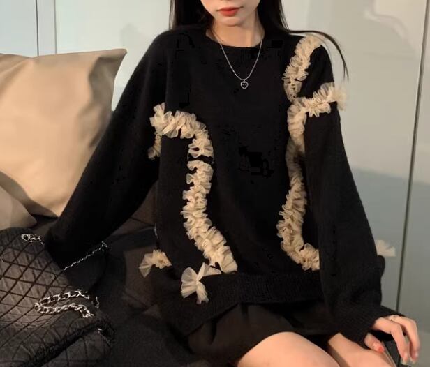 レディース トップス ニット セーター プルオーバー ミドル丈 長袖 ラウンドネック レース かわいい 大人可愛い カジュアル おしゃれ レトロ ラフ ガーリー ルーズ 個性的 モダン 存在感 ラブリー キュート ラグジュアリー アクティブ シック 高級感 芸術的 アーティスティック フェアリー 無地 立体装飾 秋 冬 10代 20代 学生 デート お出かけ 普段使い 着回し トレンド 流行 ゆったり ゆる フリーサイズ 大きめ オーバーサイズ ブラック