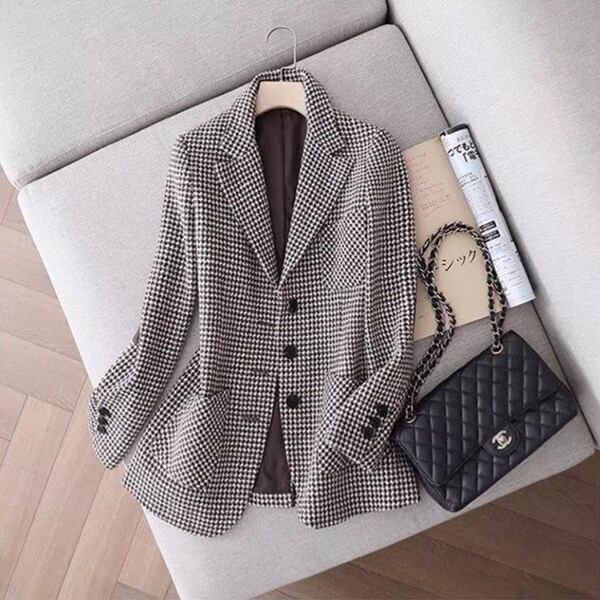 千鳥格子の小さなブレザー/スリムフィット スーツ風 レディース トップス ジャケット ブルゾン アウター ウール 長袖 スリム フォーマル スマート フィット ポケット フェイクレザー 異素材ミックス ウール 大人可愛い 上品 おしゃれ かっこいい エレガント モダン オフィスカジュアル 千鳥格子 ロングシーズン シーズンレス ミーティング プレゼン 多用途 20代 30代 ビジネス 通勤 カフェ 普段使い フィット