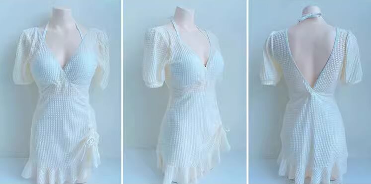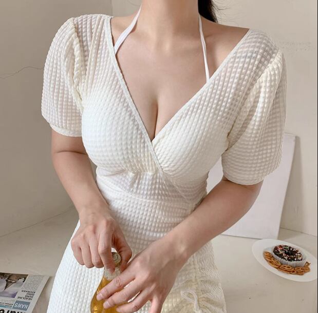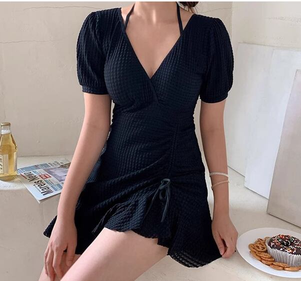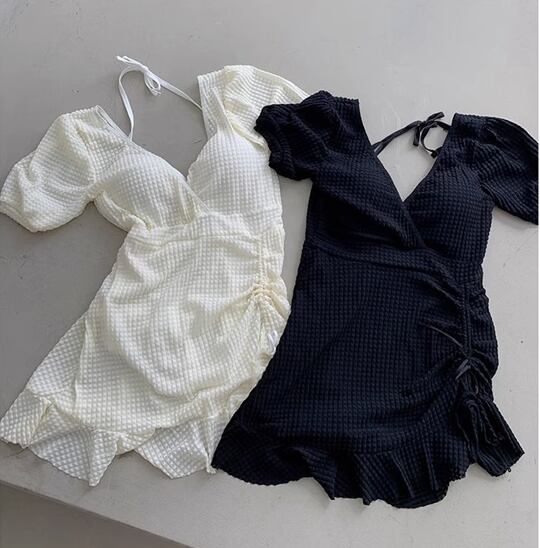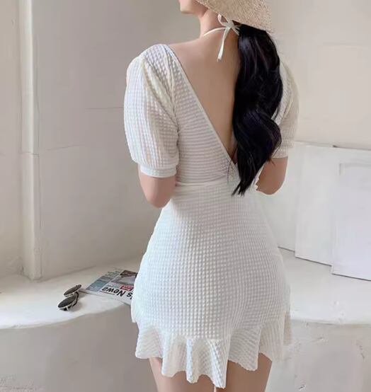 水着 レディース ワンピース 体型カバー ホルターネック パッド付き 半袖 ワイヤー入り 背中開き バックレス かわいい 大人可愛い きれいめ シンプル カジュアル 大人っぽい おしゃれ お洒落 キュート ガーリー スタイリッシュ セクシー フェミニン ヘルシー シック 無地 リゾート 旅行 温泉 プール 夏 着痩せ 背中見せ スタイルカバー お腹カバー M L XL Aカップ Bカップ Cカップ ホワイト ブラック