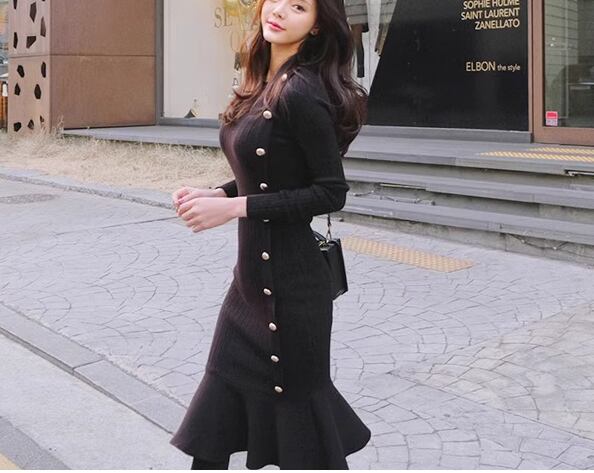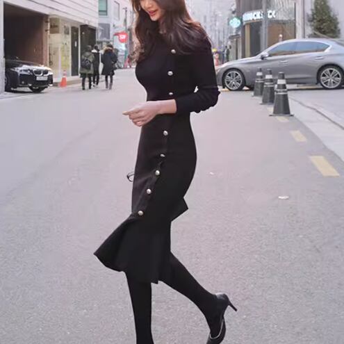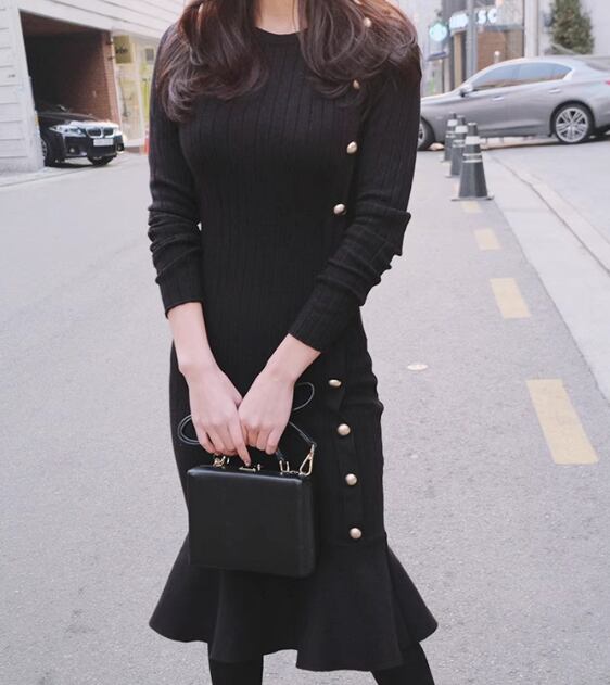 レディース ワンピース プルオーバー ニットワンピ ミモレ ロング 長袖 ラウンドネック タイト スリム 細身 マーメイド スマート フィッシュテール ボタン 大人可愛い きれいめ シンプル カジュアル 上品 おしゃれ かっこいい こなれ感 エレガント ラグジュアリー ナチュラル セクシー シック 高級感 スタイリッシュ 無地 秋 冬 デート お出かけ 韓国 普段使い モテ S M L XL 小さめ フィット ブラック
