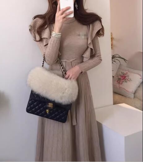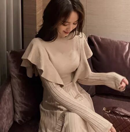 上品で落ち着いた色味と女性らしい上品なデザインが大人可愛いミモレ丈のニットワンピース。