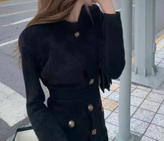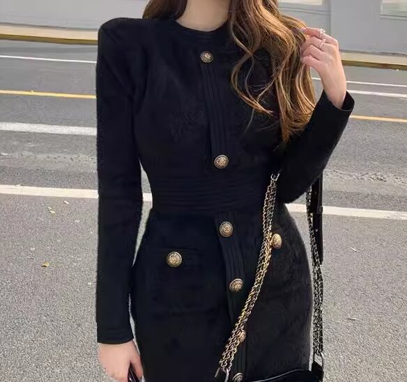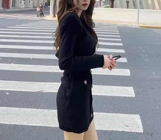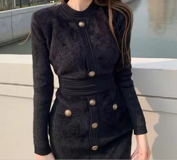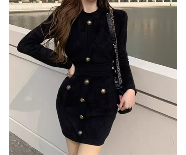 レディース ワンピース ミニ ショート 長袖 ラウンドネック タイト スリム 細身 ウエストマーク ボタン 厚手 ベルベット 大人可愛い きれいめ カジュアル 上品 おしゃれ かっこいい こなれ感 クール エレガント ラグジュアリー 知的 セクシー ハンサム シック 高級感 スタイリッシュ 無地 秋 冬 10代 20代 デート お出かけ 普段使い モテ S M L XL 小さめ フィット ブラック