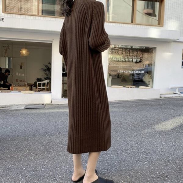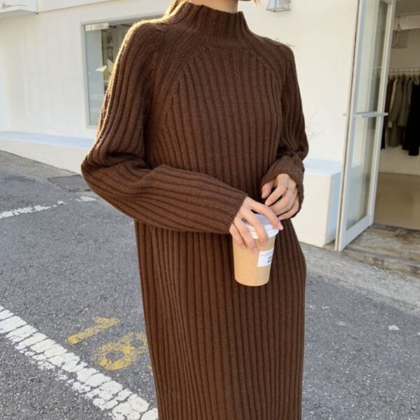 ウール素材のトレンディなハーフタートルカラーのストリートニットドレス。ミモレ丈でストレートなシルエットがルーズな美しさ感じさせます。ボトムのセータースカートのスタイリングは動きやすさを叶えたシルエットを魅せてくれます。膝下のミッドレングスで、季節を問わず、着回し力抜群のアイテムです。