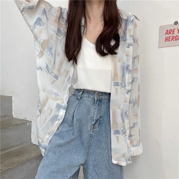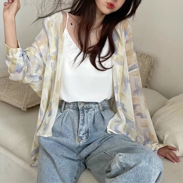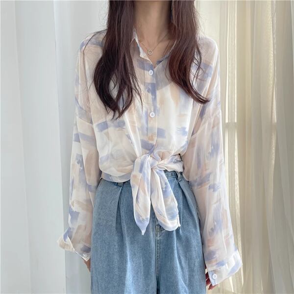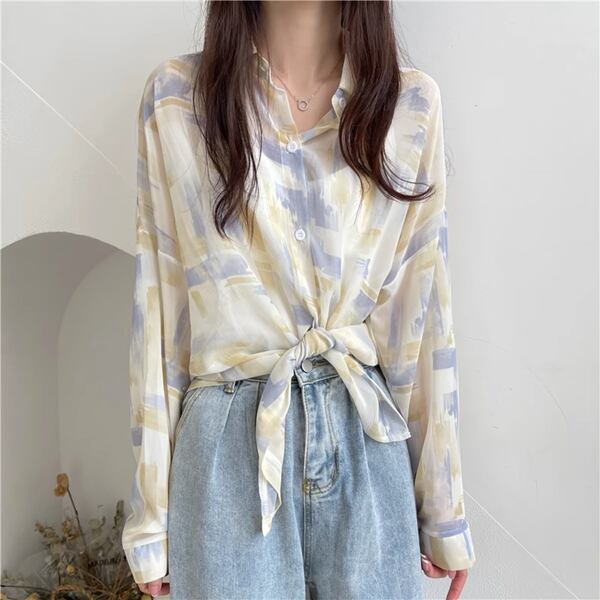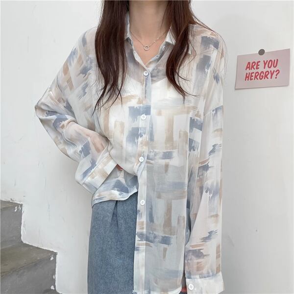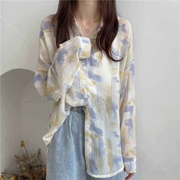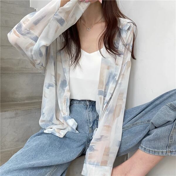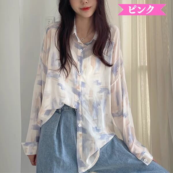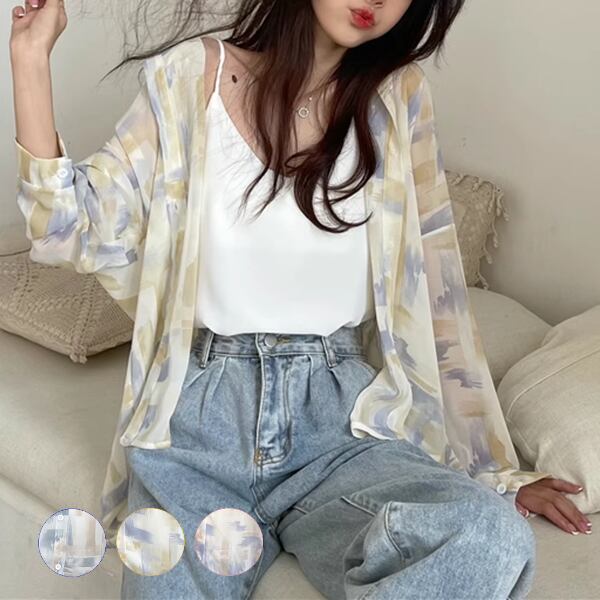 3色展開 薄手のルーズシャツ レディース トップス ジャケット シャツ ブラウス カーディガン アウター 上着 丈長 長袖 レギュラースリーブ 襟付き ステンカラー ストレート フェミニン シフォン ふっくら バイカラー 大人可愛い カジュアル 上品 おしゃれ かっこいい オフィスカジュアル プリント 春 夏 秋 10代 20代 30代 オフィス 通勤 通学 アウトドア 公園 ガーデン ショッピング カフェ 日焼け防止