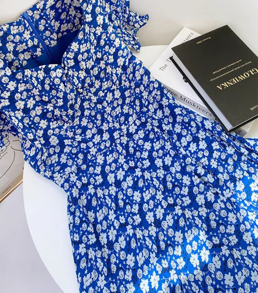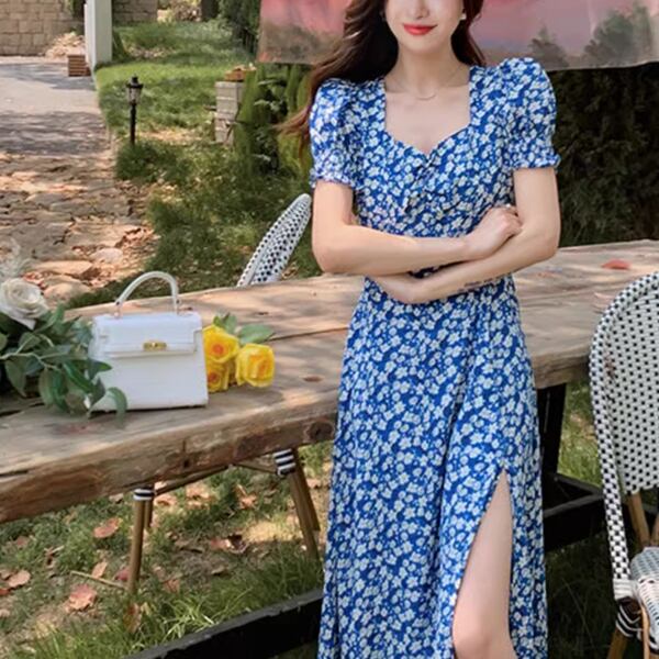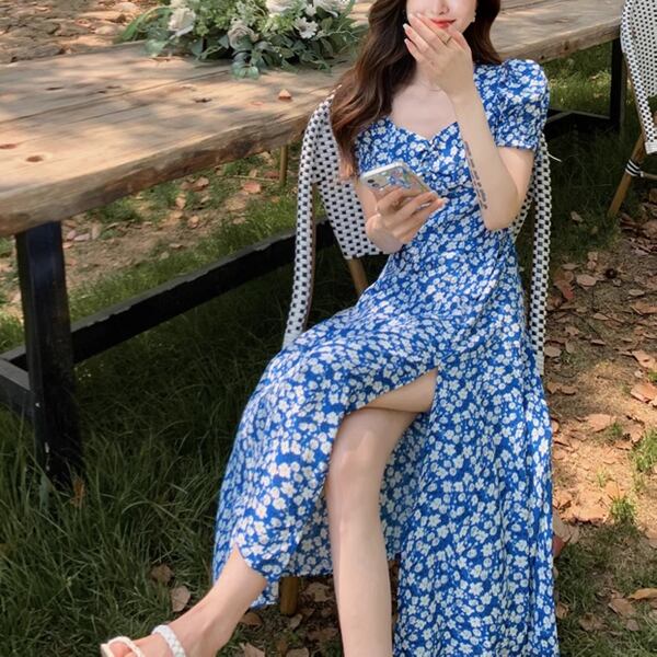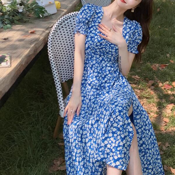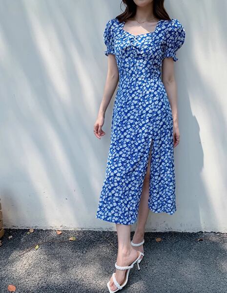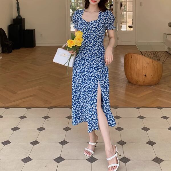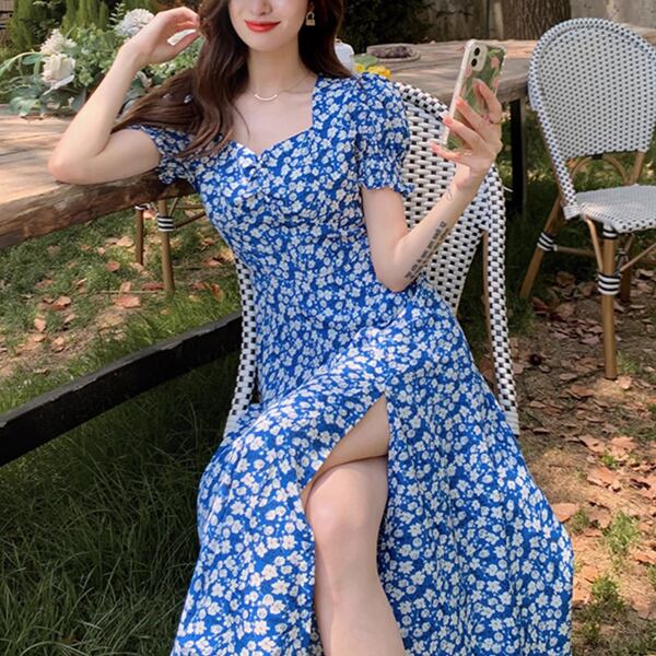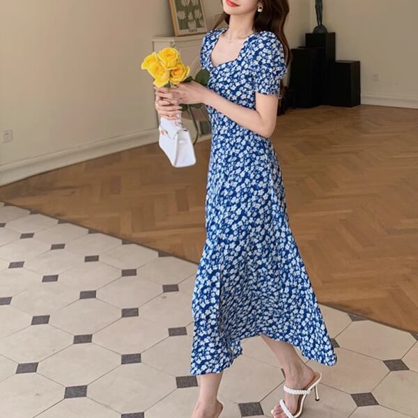 ティーブレイクブルーの花柄ドレス レディース ワンピース ドレス イブニングドレス パーティードレス ナイトドレス ミモレ ロング 半袖 スクエアネック ノーカラー セミフレア Aライン フェミニン サイドスリット きれいめ おしゃれ かっこいい ガーリー エレガント キュート 爽やか ファンシー シフォン 花柄 春 夏 秋 10代 20代 オフィス 通勤 イベント 休日 ガーデン ショッピング カフェ コーデ 普段使い