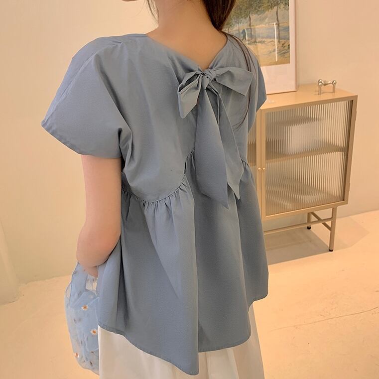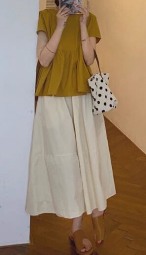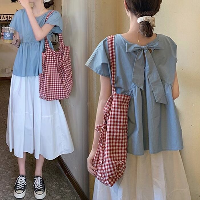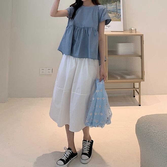 二点セット 上下セット ツーピース レディース スカート トップス プルオーバー フレア 膝下 半袖 ラウンドネック 襟なし フレア フリル リボン バックリボン 薄手 コットン かわいい 大人可愛い カジュアル 爽やか 優しい 涼しげ 無地 春 夏 デート お出かけ 公園 女子会 休日 楽ちん 普段使い 着回し M L XL 2XL ゆったり ゆる ホワイト イエロー ブルー
