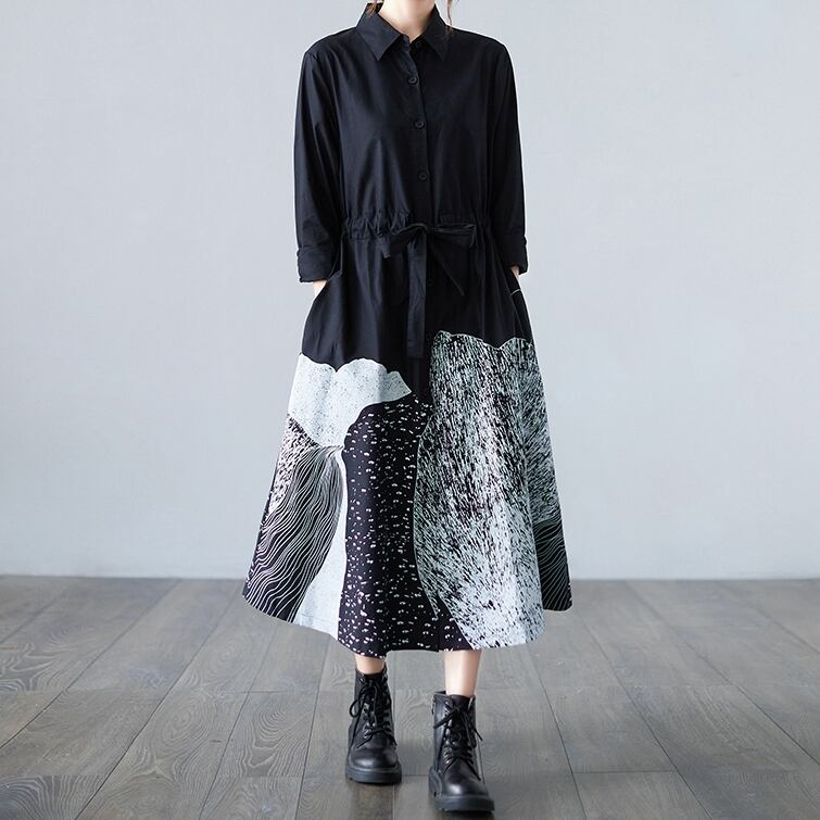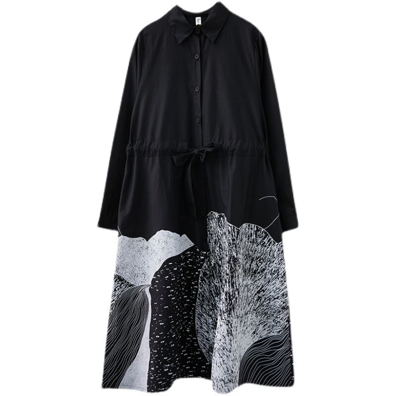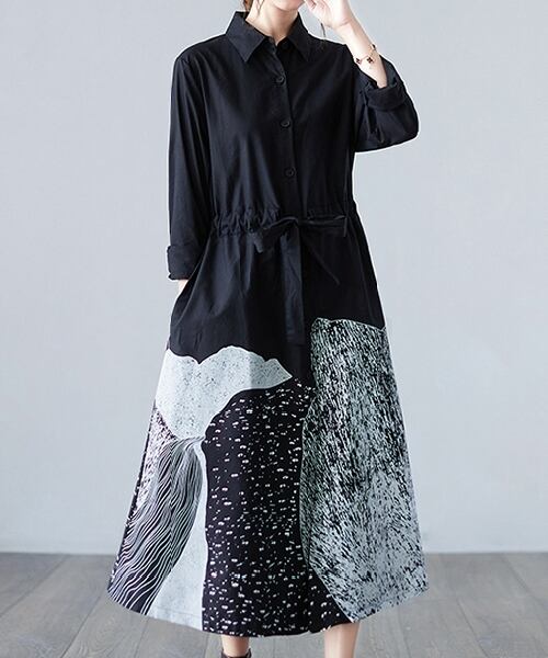 レディース ワンピース シャツワンピ フレア 前開き ミモレ 長袖 襟付き 角襟 ポロカラー フレア Aライン ウエストマーク ウエストリボン ポケット ハイウエスト 前開き ウエストゴム ボタン バイカラー 大人可愛い おしゃれ 個性的 モード系 存在感 プリント オールシーズン お出かけ 休日 楽ちん 普段使い L XL 2XL ホワイト ブラック モノトーン 大人カラー
