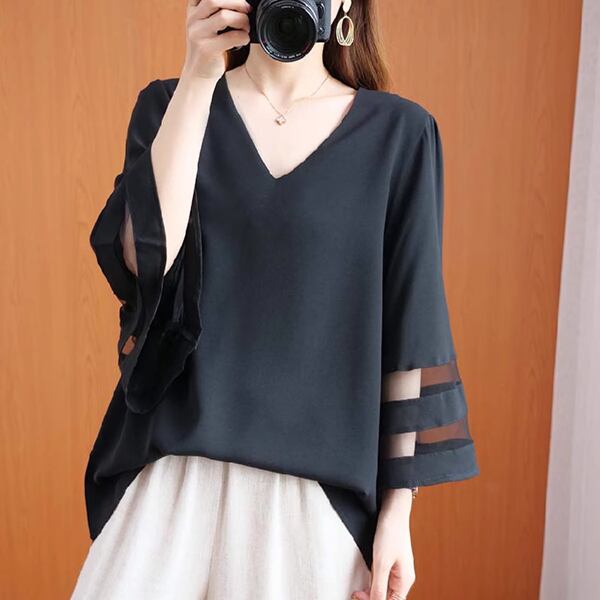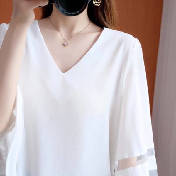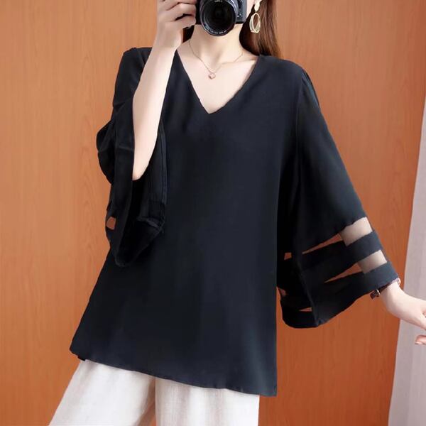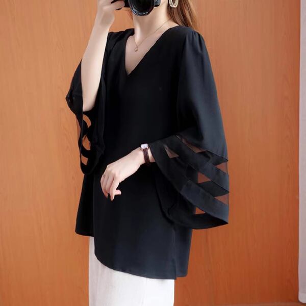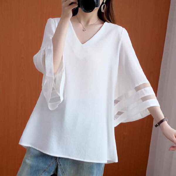 大きいサイズの方にもおすすめの、メッシュ素材、トランペットスリーブが魅力のシャツです。ルーズなシルエットとシフォン素材が軽やかな着心地を提供し、快適な装いを実現。日常から特別な場面まで、幅広いシーンで活躍します。洗練されたデザインで個性を演出し、ファッションを楽しんでください。大きいサイズのトレンディでスタイリッシュな一枚。お楽しみください。